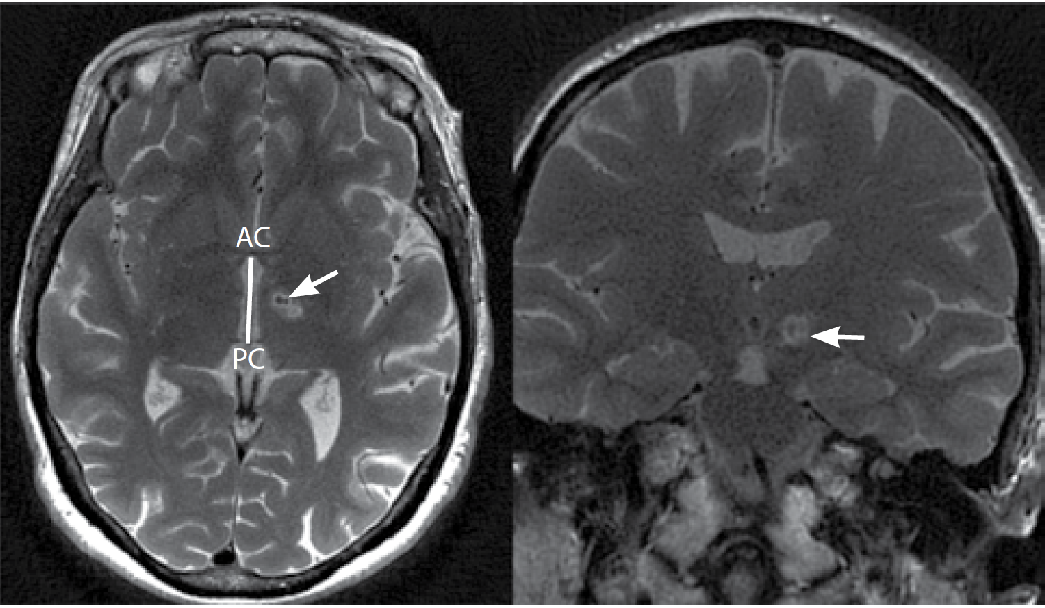 Fig. 2. Axial and coronal MR images in 30 days after right PTT MRgFUS destruction.