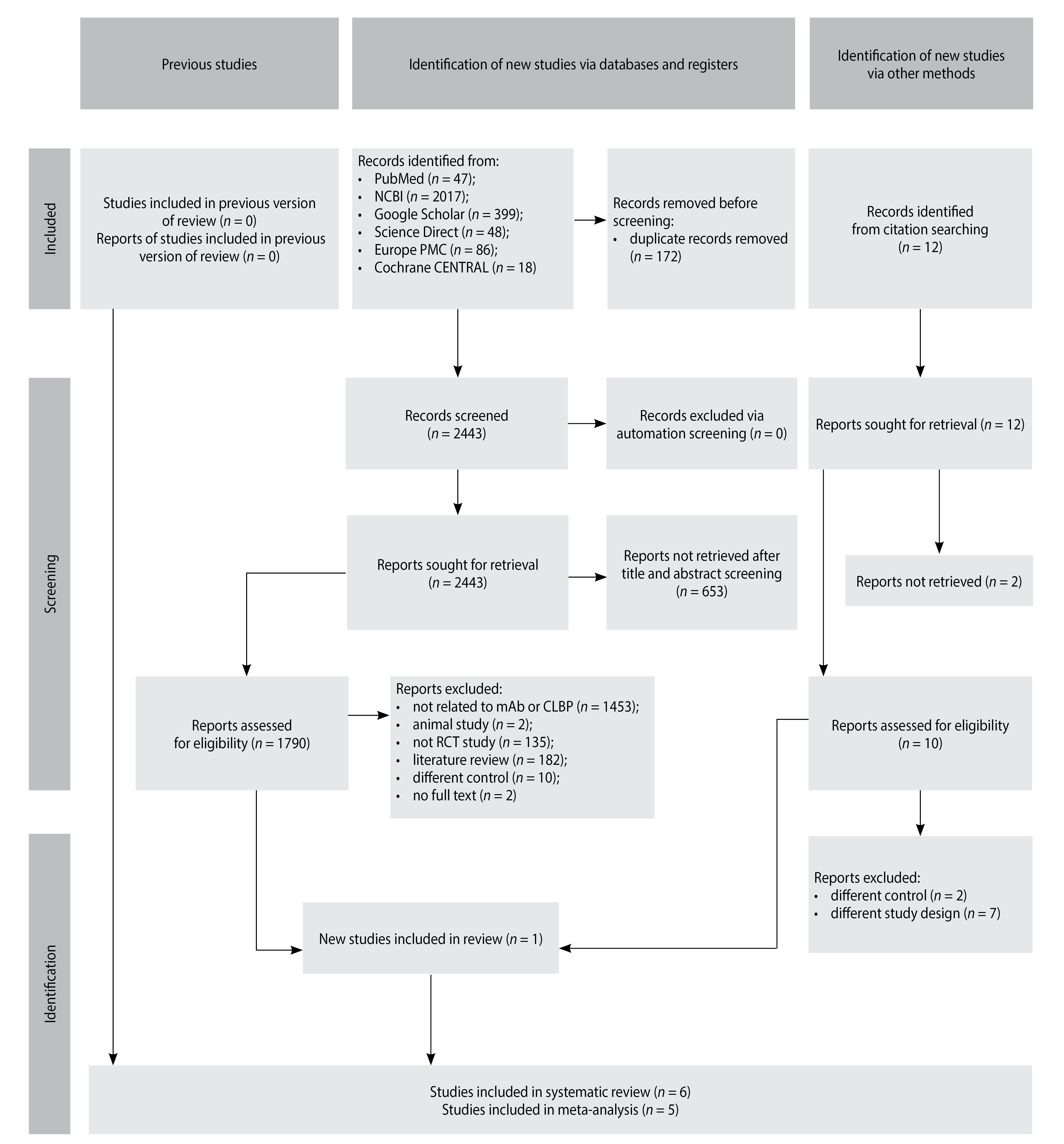 We screened 2,443 records, and after removing duplicate studies, studies that are not related to mAb or CLBP, ani-mal studies, non-randomised controlled trials, literature reviews, ineligible control, and reports without the full text, we screened article meeting inclusion criteria. Six clinical trials were included in this review study based on PRISMA algorithm (Fig. 1).