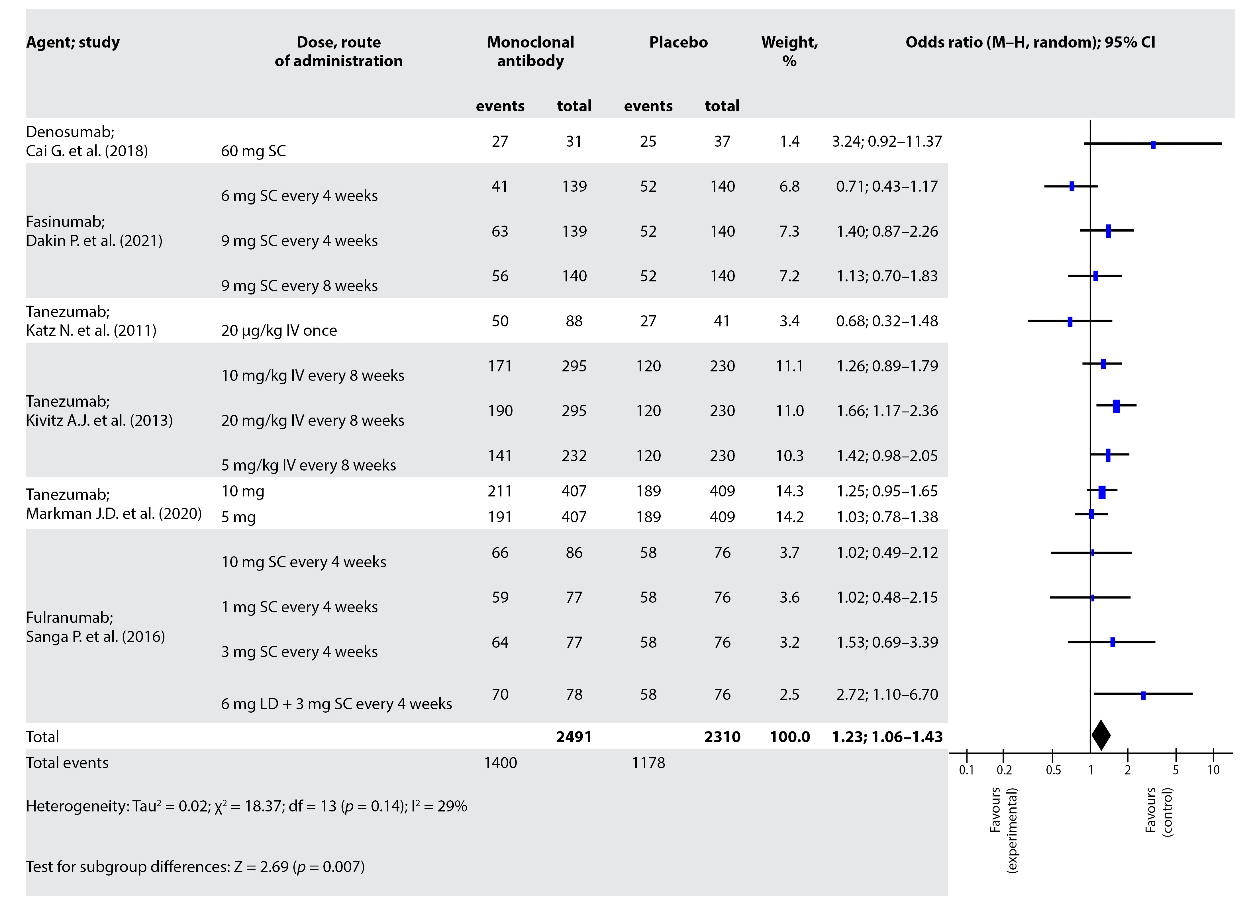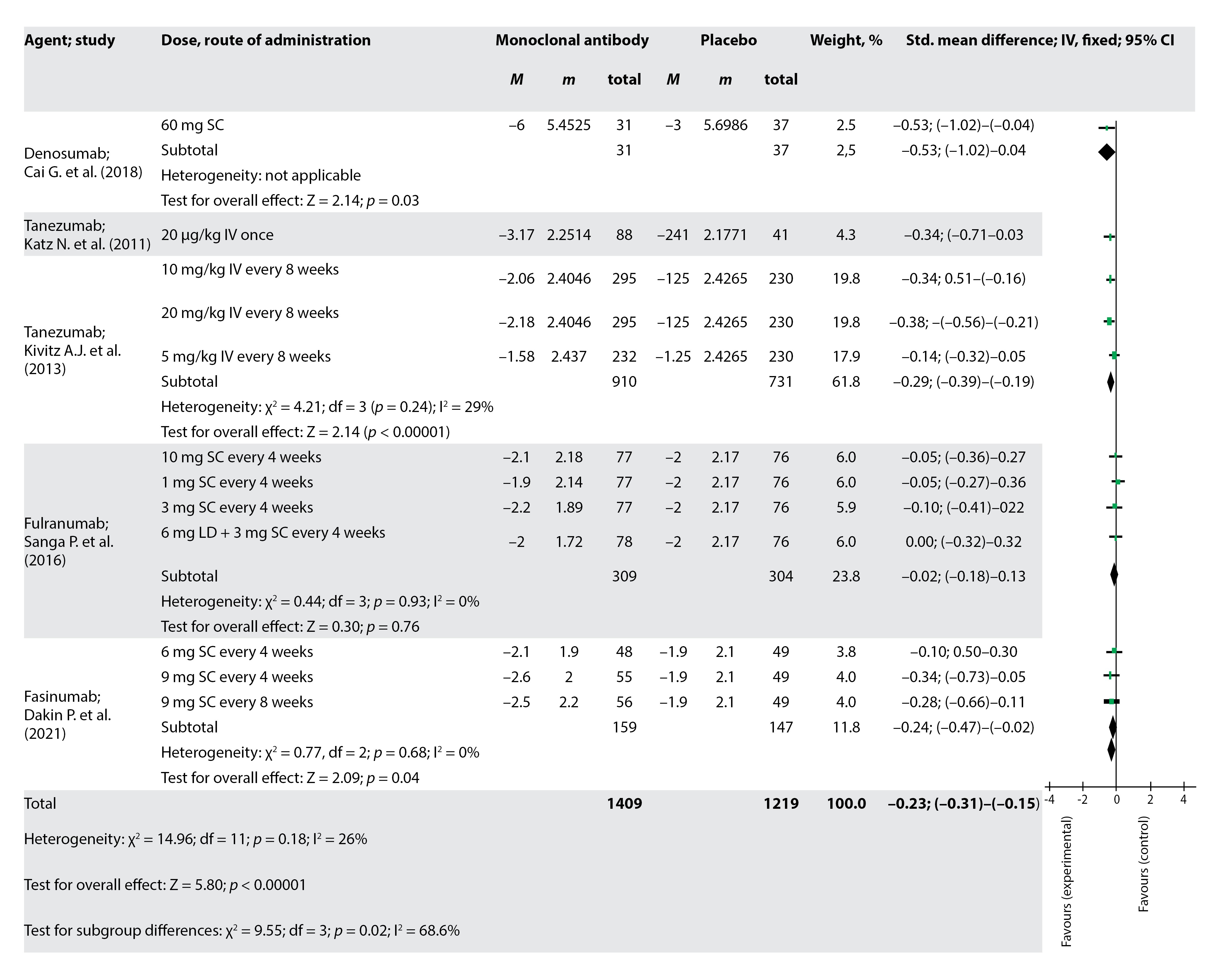 Review Manager 5.4 software was used to perform this meta-analysis. The primary outcome of this study is the difference in LBPI and RMDQ scores. We calculated the weighted mean difference and 95% confidence intervals (CI) for changes from the baseline level in the mAb-group vs the control group. We calculated the odds ratio (OR) and 95% confidence intervals (CI) for the risk of adverse events in both groups. A random-effects model was used when I2 > 50% or p < 0.1; when I2 ≤50% and p > 0.1, a fixed-effect model was used to merge the data. The degree of heterogenicity was assessed based on the I2 statistics A value of I2 < 25% was deemed low heterogenicity, 26–50% moderate heterogenicity, and > 50% high heterogenicity. Subgroup analyses were done based on each drug used (denosumab, fasinumab, tanezumab, fulnarumab).