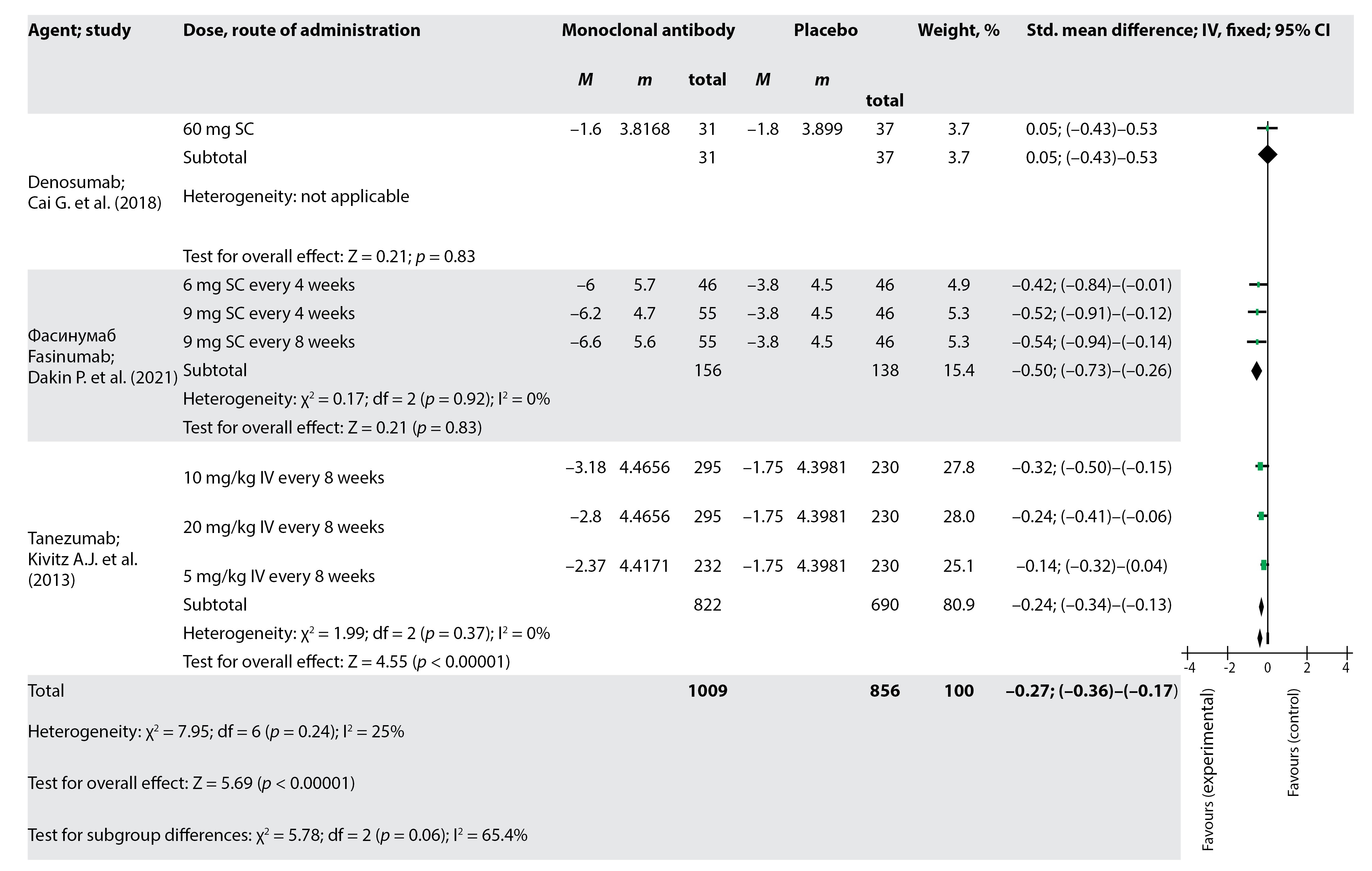 Fig. 2. Effect of monoclonal antibodies divided by each type of drug compared with placebo by LBPI score changes from baseline.