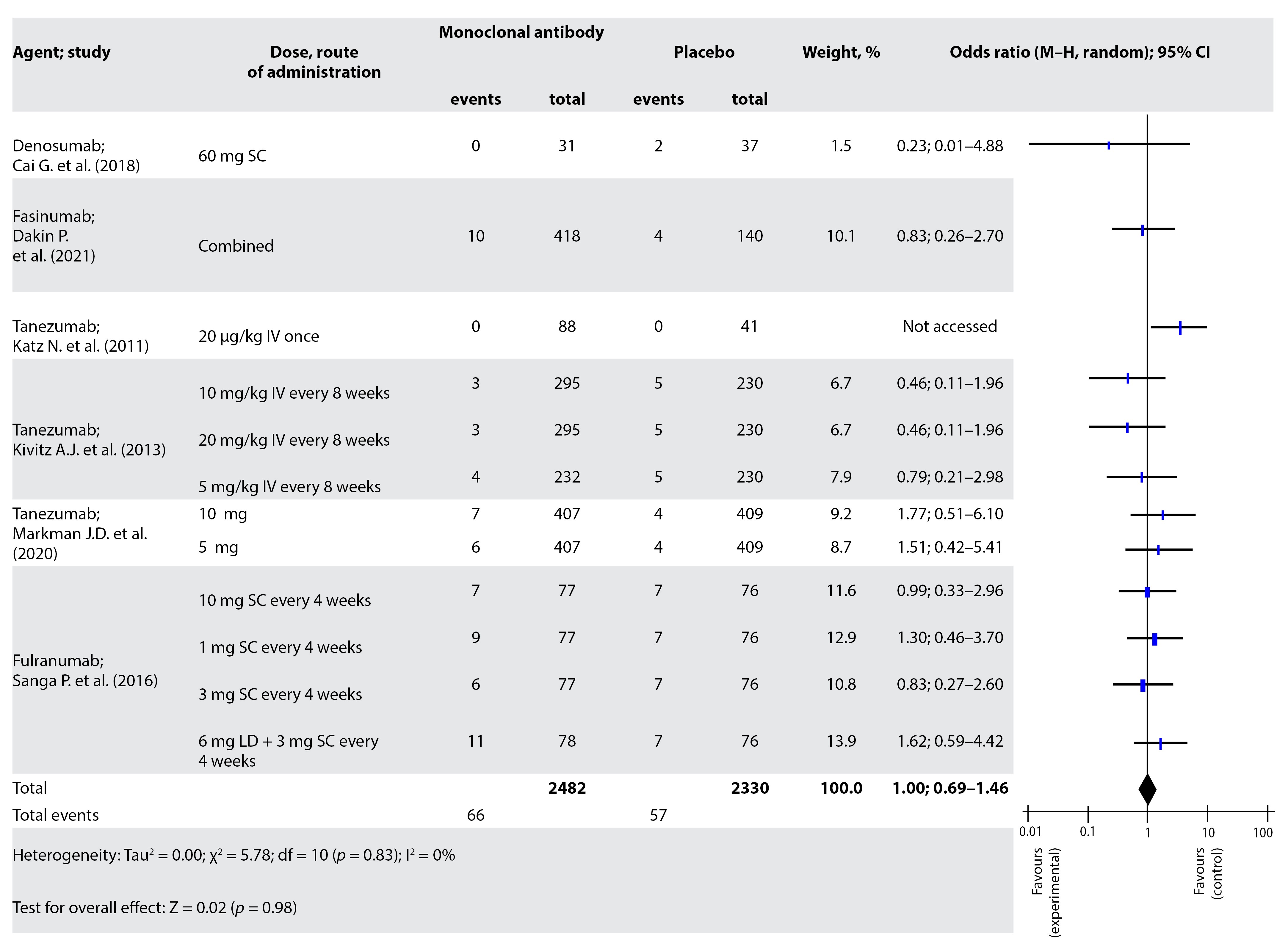 Meta-analysis of six trials indicates that mAb have significantly greater odds of adverse events, favouring the placebo group (OR 1.23; 95% CI 1.06 to 1.43; p = 0.007). Moderate heterogenicity was found in the analysis with I2 29% (Fig. 4). However, meta-analysis demonstrated no greater risk regarding the serious adverse events in mAb vs. placebo with OR 1.00 (95% CI 0.69 to 1.46; p = 0.98; Fig. 5).