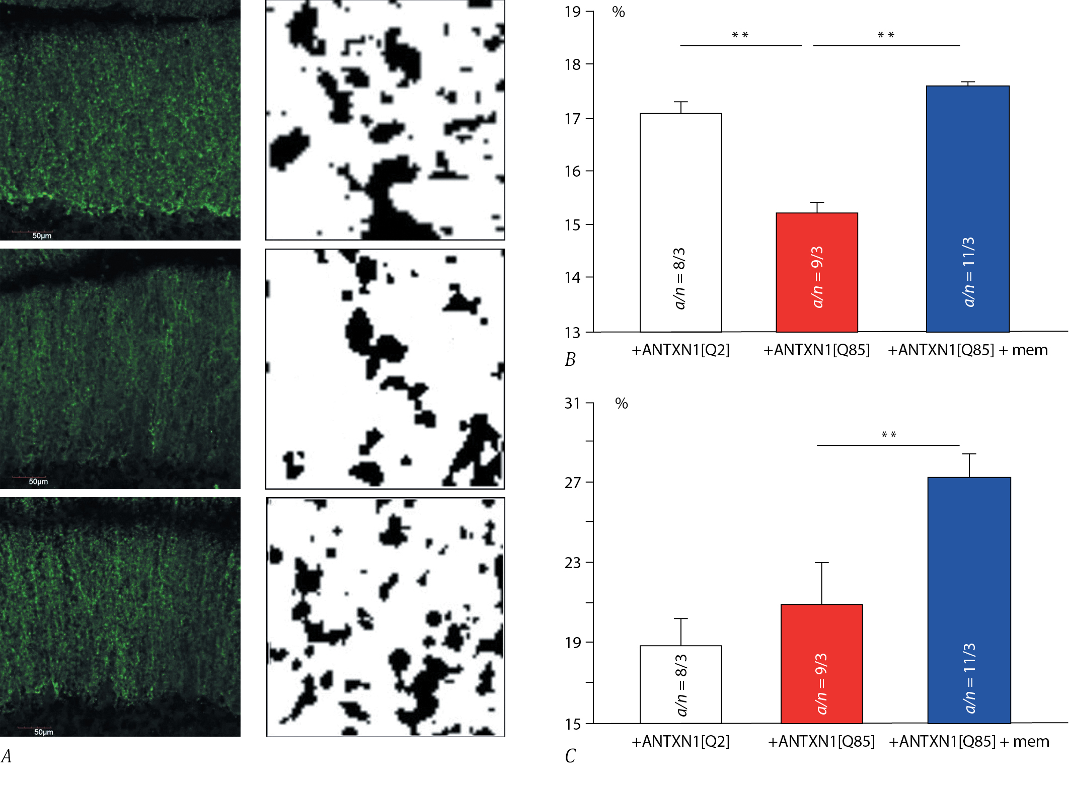 Fig. 1. EAAT1 expression in animals receiving and not receiving memantine. A — fluorescent microphotographs of the cerebellar cortex slices labeled with anti-EAAT1 (left panel). The images processed with ImageJ software (right panel). Chart scales are 50 and 5 μm respectively. B — proportion of anti-EAAT1 positive signal area. C — total amount of anti-EAAT1 positive spots. а/n — number of examined areas/animals. **p < 0.01.