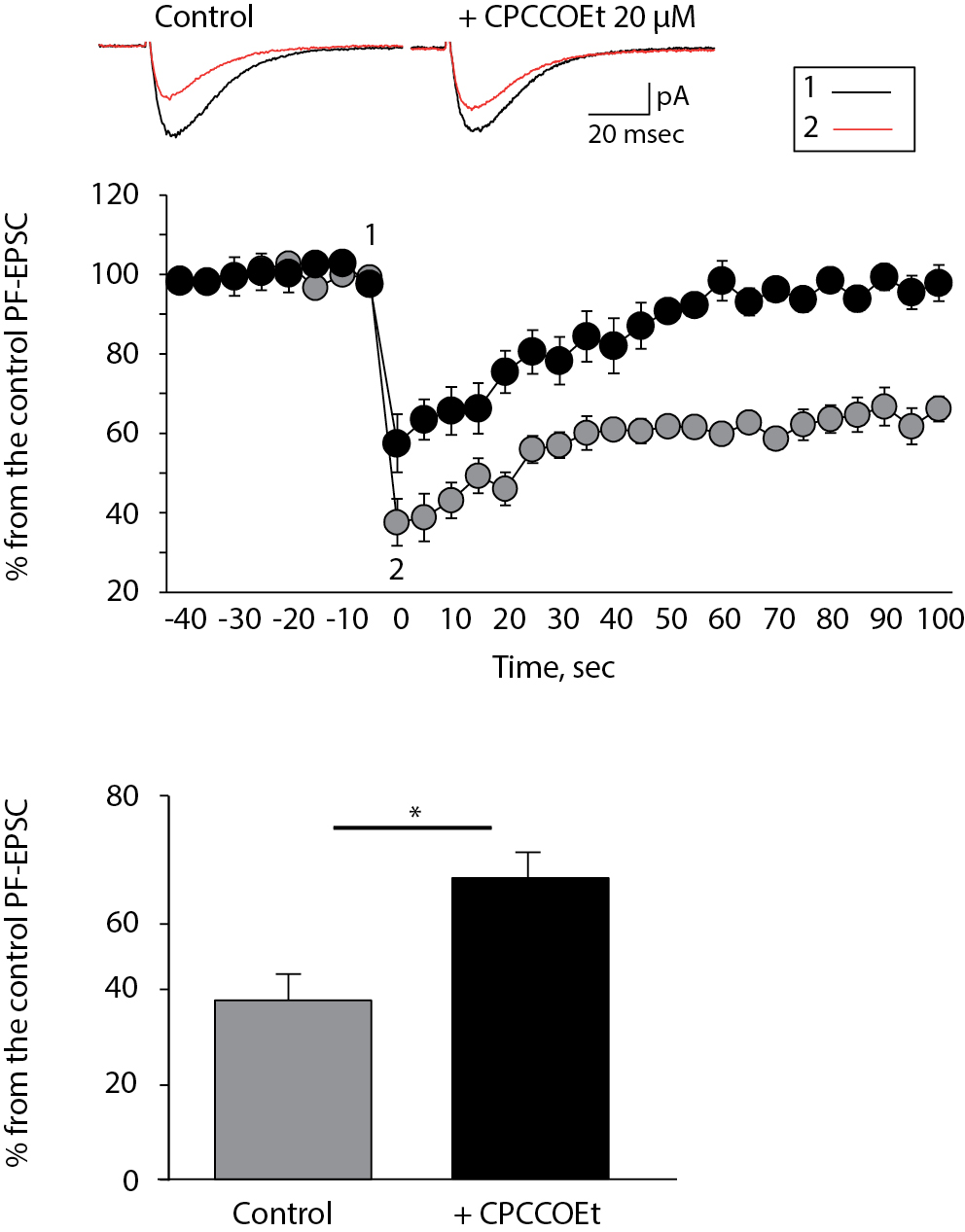 In the presence of 25 µm СРССОЕt, an mGluR1-specific blocker, the amplitude PF-EPSC began to rise immediately after the tetanic stimulation: from 37.6 ± 5.9 to 63.5 ± 5.0% (с/n = 7/3; р = 0.026, the paired t-test; Fig. 3).