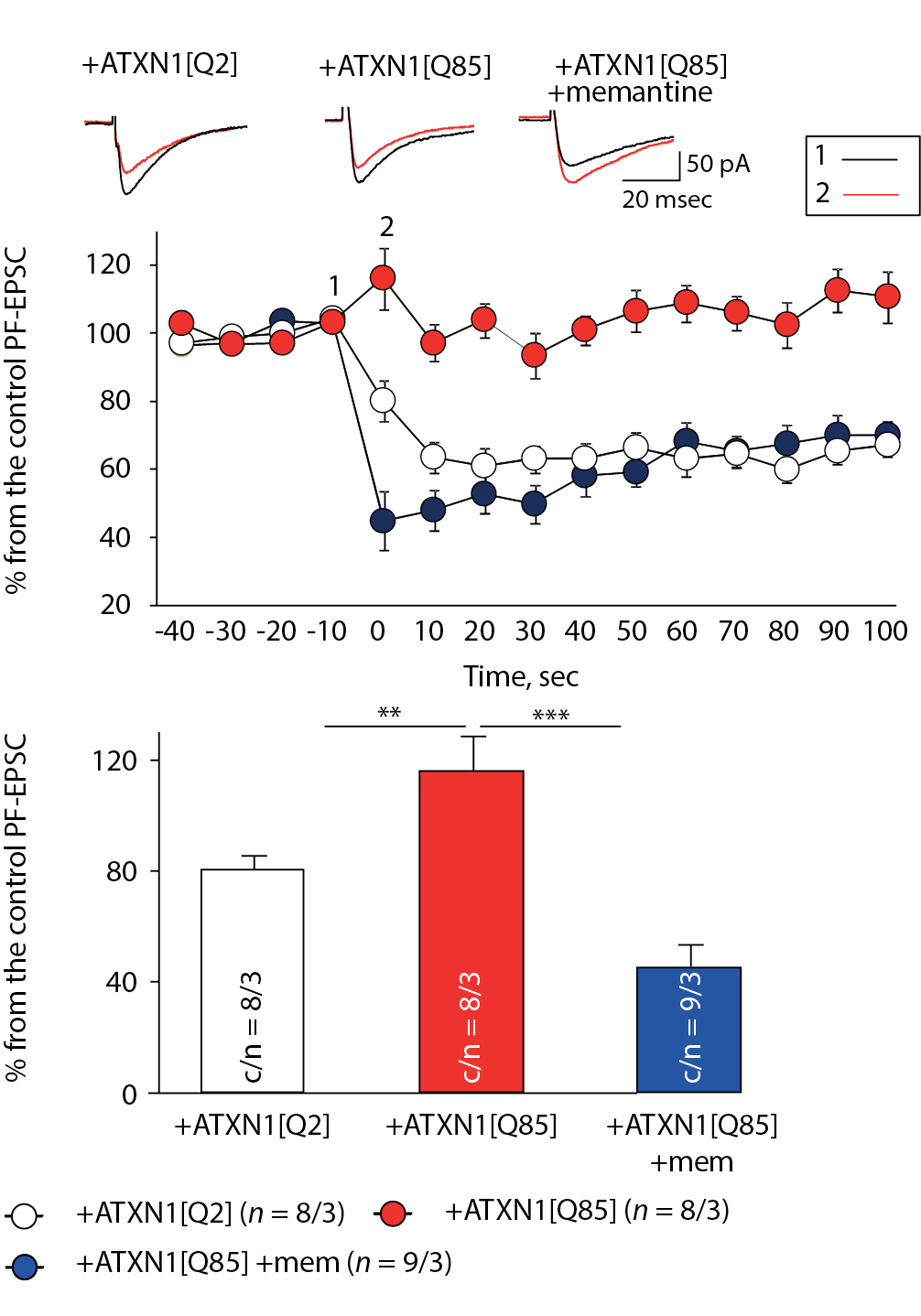 After the tetanic stimulation in ATXN1[Q85] mice the PF-EPSC amplitude increased (116.1 ± 8.9% [c/n = 8/3]). The amplitude inhibition was not detected, while in ATXN1[Q2] mice the PF-EPSC amplitude dropped after the stimulation and stayed reduced during the whole period of recording (79.1 ± 14.1%; c/n = 8/3; p < 0.01; Fig. 4). Long-term memantine administration restored the SSE level: the amplitude after the stimulation has dropped (44.9 ± 8.5%; c/n = 9/3; p < 0.001 versus the mice without memantine consumption); the changes of amplitude restoration were similar to those in ATXN1[Q2] mice (Fig. 4).