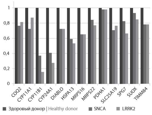 Заключение. Выявленные в настоящем пилотном исследовании изменения экспрессии генных сетей подтверждают роль нарушений митохондриального гомеостаза в молекулярном патогенезе БП и могут способствовать разработке биомаркеров и поиску новых терапевтических мишеней при SNCA- и LRRK2-ассоциированных формах заболевания.
