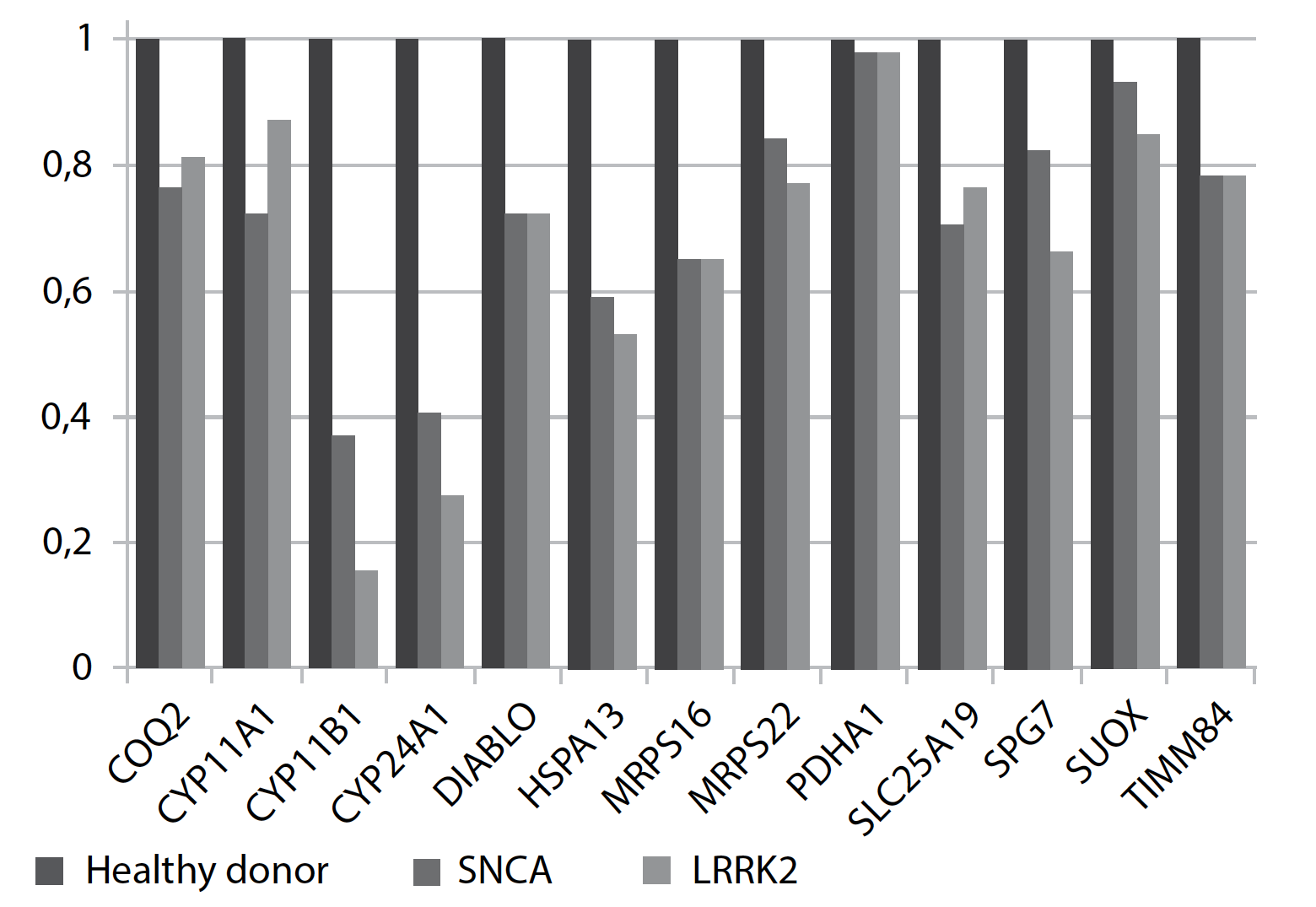 В нашем пилотном исследовании, благодаря использованию платформы «NanoString», была оценена экспрессия более 100 генов, ассоциированных с работой митохондриального аппарата. При сравнении характеристик нейронов, полученных от пациентов с генетическими формами БП и здорового донора, были выявлены различия в экспрессии генов, продукты которых связаны с активностью окислительного фосфорилирования, циклом трикарбоновых кислот, биосинтезом аминокислот, окислением жирных кислот, метаболизмом стероидов, гомеостазом кальция в клетке, утилизацией свободных радикалов. Ряд генов показал также дифференцированную экспрессию в культурах с мутациями SNCA и LRRK2, при этом, помимо ряда уже указанных выше функций, данные гены контролируют митофагию, синтез митохондриальной ДНК, окислительные реакции, процессы детоксикации клетки и апоптоз, метаболизм белков и нуклеотидов.