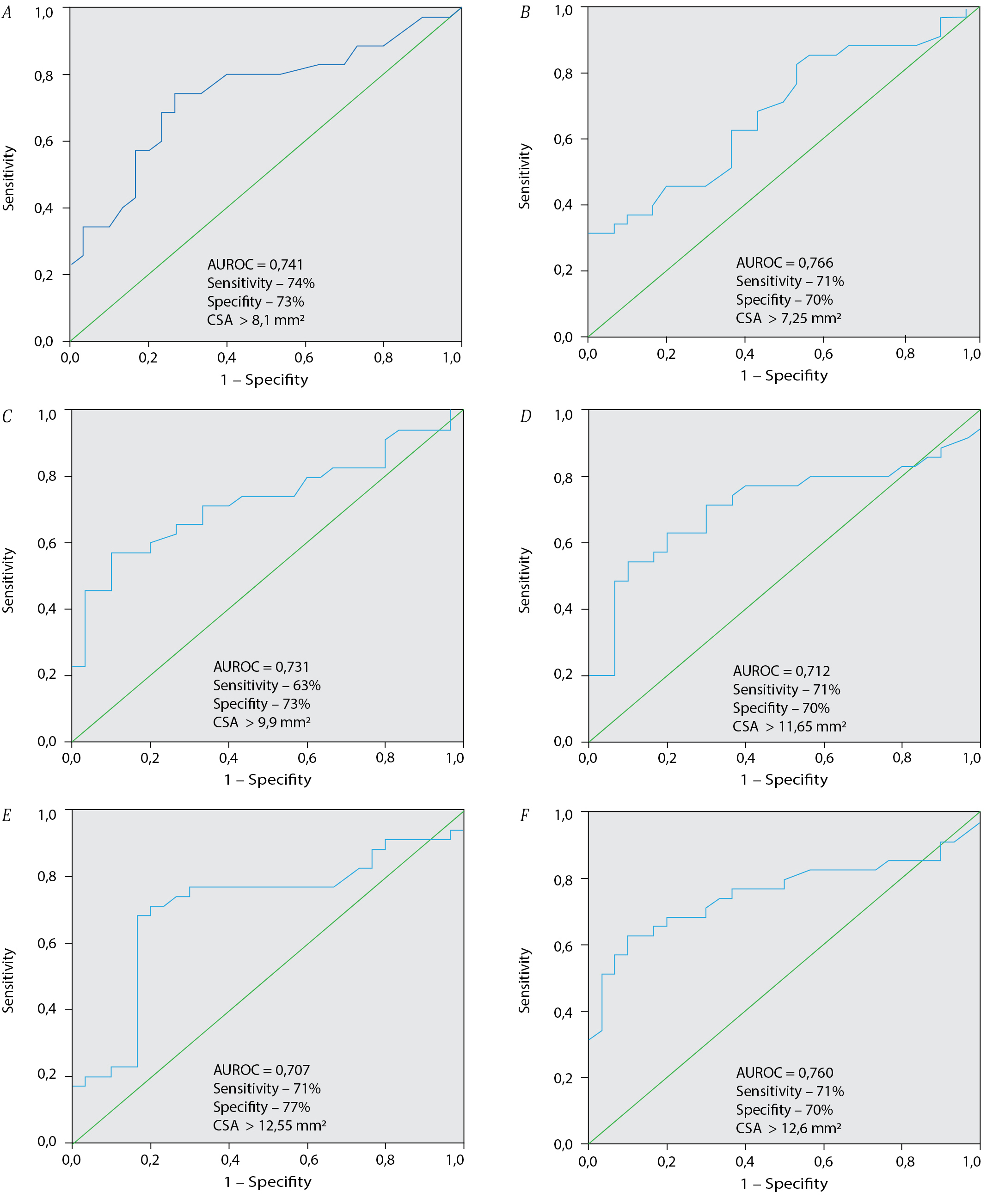 We used independent samples t-test to compare two independent data groups by quantitative variables in Gaussian distribution and Mann–Whitney U test to compare them in non-Gaussian distribution. We used Pearson's χ2 test to compare two independent data groups by categorical variables and Fisher's exact test under constraints. We performed ROC analysis to assess the possible use of median nerve CSA as a diagnostic marker. We determined optimal thresholds with the Youden's index calculated as sensitivity and specificity sum minus 1.