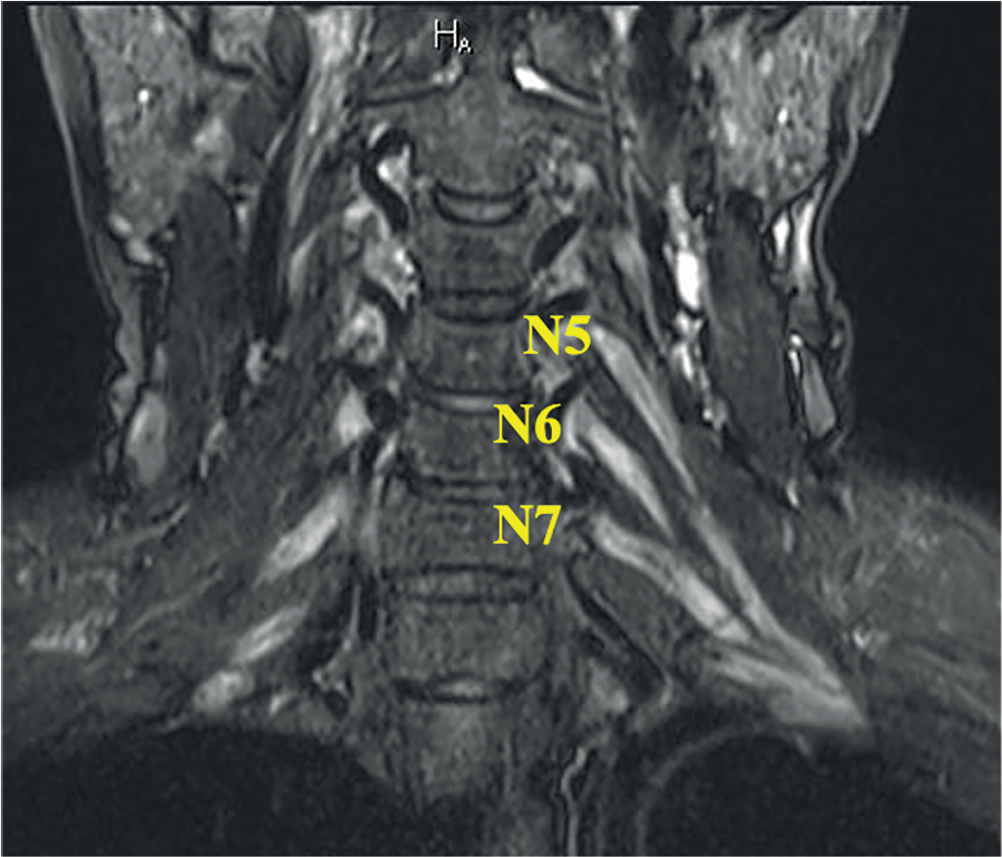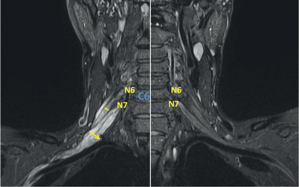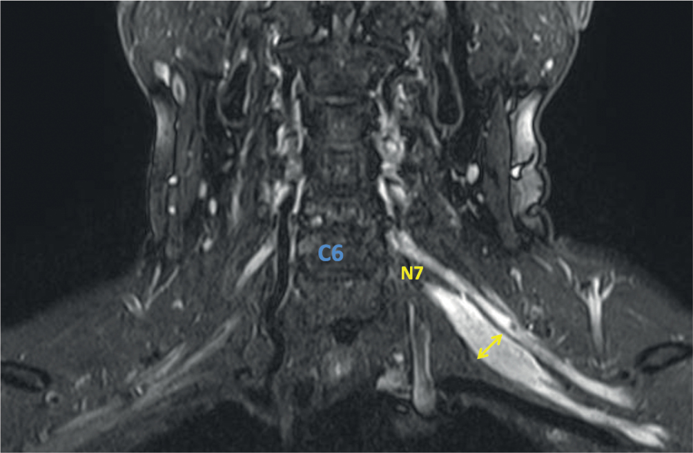 6. Fig. 5. BP MRI in a MMN patient (10-year follow-up history, pre-therapy assessment). The coronal STIR MRI showed left-sided local N7 (≤ 11 mm) primary trunk thickening, with hyperintense signal. Thickness of other BP elements remained unchanged; however, hyperintense MRI signal was registered bilaterally.