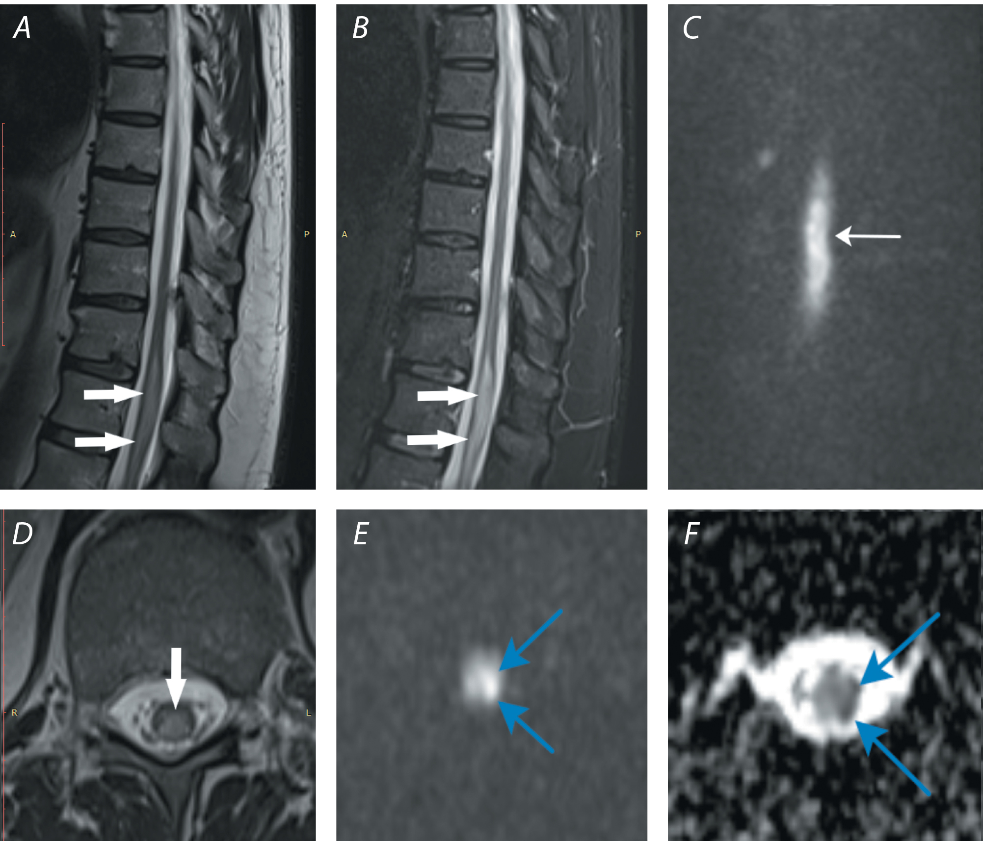 E) DWI, axial plane: intramedullary hyperintense lesion on the right at Th11–Th12 (blue arrows), b = 800;