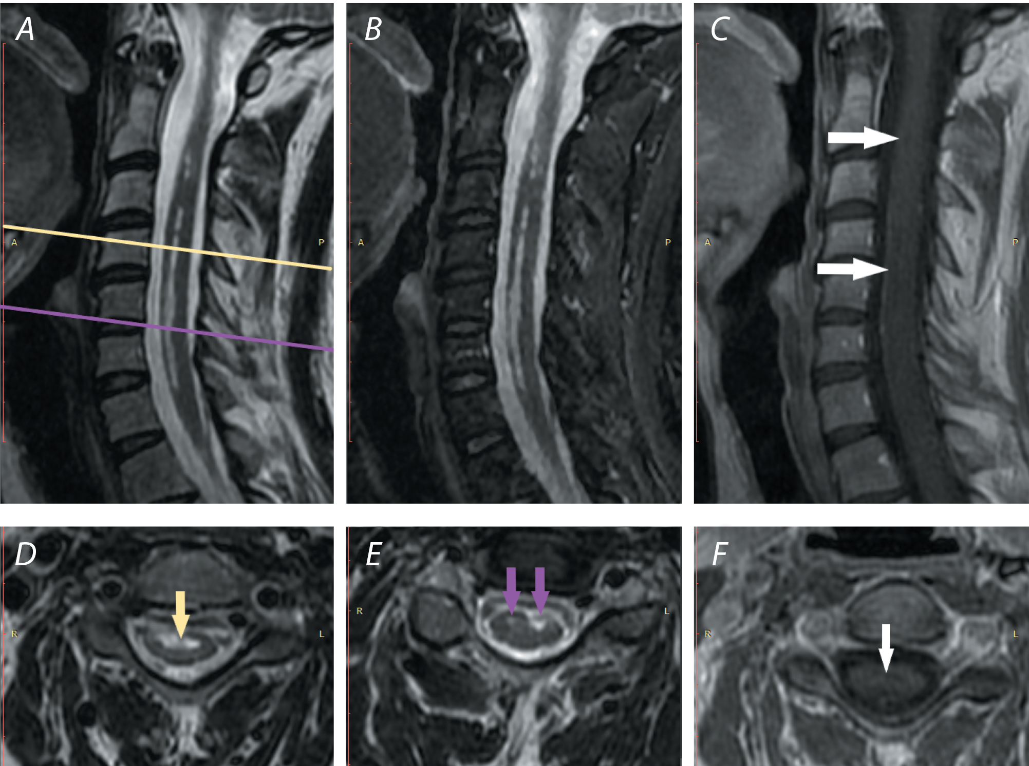 A) T2-weighed image, sagittal plane: multifocal intramedullary hyperintense elongated lesion at C2–C3, C3–C7; the light-yellow line indicates the section at C3 (D), the purple line indicates the slice at the C5–C6 intervertebral disc level (Е);
