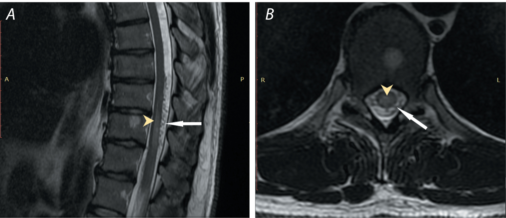 A — Т2-ВИ, сагиттальная плоскость; B — Т2-ВИ, аксиальная плоскость: визуализируются интрамедуллярный гиперинтенсивный очаг преимущественно дорсальной локализации на уровне Th9–Th11 (светло-жёлтая стрелка), гипоинтенсивные расширенные перимедуллярные сосуды, преимущественно по задней поверхности СМ на уровне Th8–Th11 (феномен «пустоты потока/flow voids», белая стрелка).