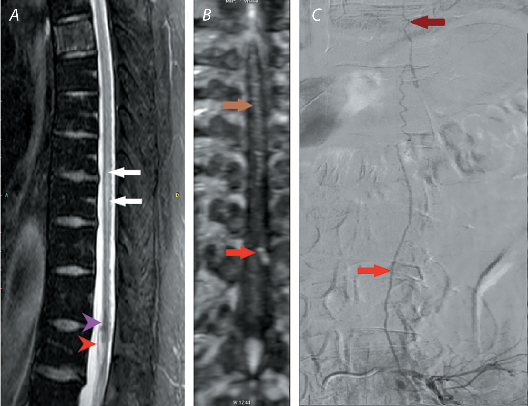 Как клинические, так и визуализационные признаки сосудистой миелопатии во многом зависят от механизмов и причин гипоперфузии СМ, связанных либо с нарушением артериального кровоснабжения, либо с венозной дисрегуляцией [12].