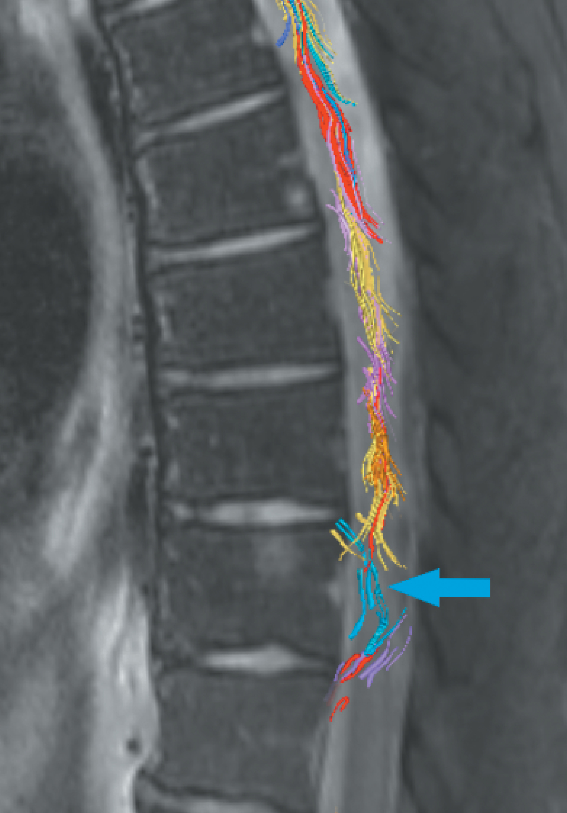 Fig. 5. 3D DTI color-coded tractography map of patient V. with spinal venous insufficiency at Th9–Th11.