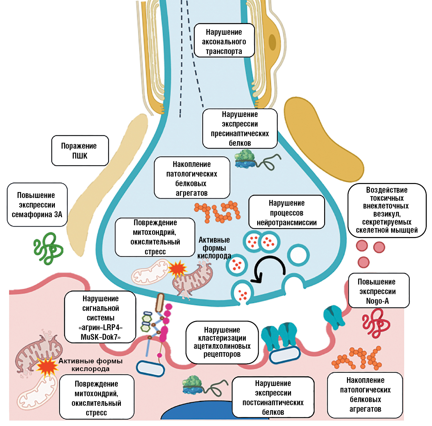 Поражение НМС при БАС является самостоятельным и ранним звеном патогенеза заболевания, о чём свидетельствуют данные, полученные в исследованиях как на трансгенных моделях заболевания, так и на пациентах с БАС (рисунок). Важно отметить, что уже на досимптомной стадии патологии в моделях БАС отмечается ряд функциональных и структурных нарушений НМС. Во всех моделях, в которых установлена денервация НМС, показана избирательная уязвимость FF-ДЕ на ранних стадиях патологии. Во многих моделях показано, что пресинаптический компартмент является более уязвимым, чем постсинаптический. Выявленные функциональные нарушения НМС при патологии БАС (по данным, полученным на трансгенных моделях) свидетельствуют о снижении надёжности нервно-мышечной передачи возбуждения как при редкочастотной, так и при высокочастотной активности. Структурные нарушения НМС при БАС заключаются в уменьшении площади и фрагментации синаптических контактов, изменении экспрессии ряда синаптических белков и других нарушениях.