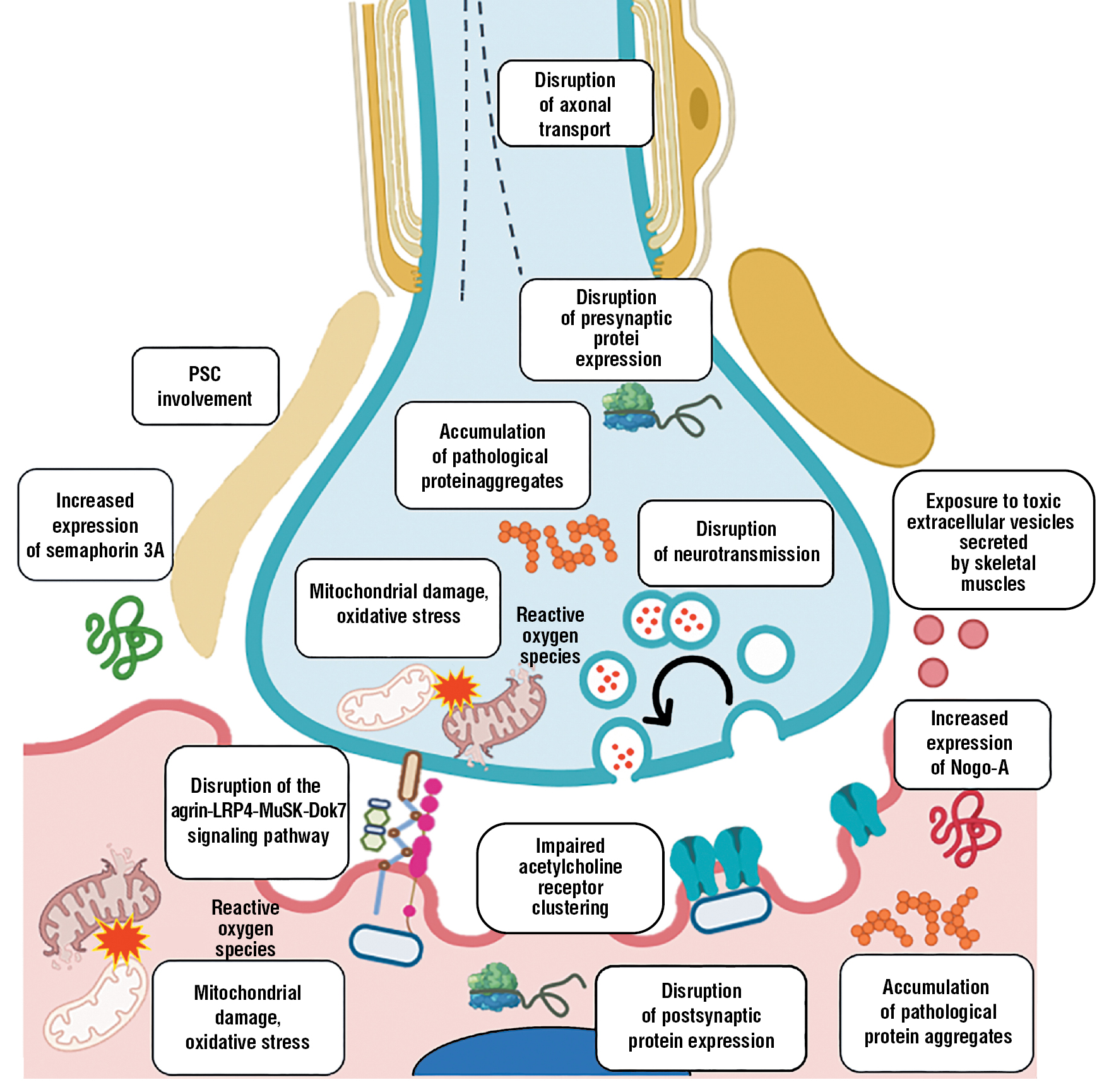 При БАС отмечаются специфические изменения в каждой части НМС — пре- и постсинаптическом компартментах, а также окружающих их ПШК. Подобные изменения неизбежно ведут к нарушению взаимодействия «мотонейрон–скелетная мышца», что, в свою очередь, способствует дальнейшему прогрессированию заболевания. В норме, когда мотонейрон с мышечным волокном образуют функциональный синапс, образованная ДЕ начинает секретировать ряд трофических и ростовых факторов, обеспечивающих выживаемость мотонейронов, рост и регенерацию аксонов, структурную и функциональную стабильность НМС, дифференцировку и сократительные свойства мышечных волокон [76]. Такой секретóм содержит высокие концентрации сосудистого эндотелиального фактора роста, глиального нейротрофического фактора, мозгового нейротрофического фактора, нейротрофинов-3 и -4, инсулиноподобного фактора роста-1 и белка, связывающего инсулиноподобный фактор роста-3. Установлено, что иннервированная скелетная мышца активно экспрессирует мышечно-специфическую микро-РНК miR-206 [77]. Считается, что miR-206 играет протективную роль, обеспечивая выживаемость синаптических контактов и активность спрутинга. Высокий уровень экспрессии miR-206 у пациентов с БАС связан с более медленным темпом прогрессирования заболевания [78].