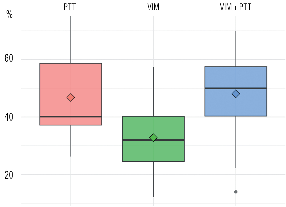 Statistically significant differences were found in percentage improvement (vs. baseline MDS-UPDRS-III score) between patients with isolated PTT and VIM ablation (p = 0.000024, Wilcoxon’s test). However, no statistically significant differences were found between PTT + VIM and PTT ablation groups (p = 0.9245). Median improvement in MDS-UPDRS-III score was 47.9% (38.8; 57.6) and 32% (24.2; 40.2) in patients with and without PTT thalamotomy, respectively. Median absolute improvement in MDS-UPDRS-III was 29 (21; 34) and 13.5 (10.2; 21) in patients with and without PTT ablation, respectively (p < 0.0001, Wilcoxon’s test).
