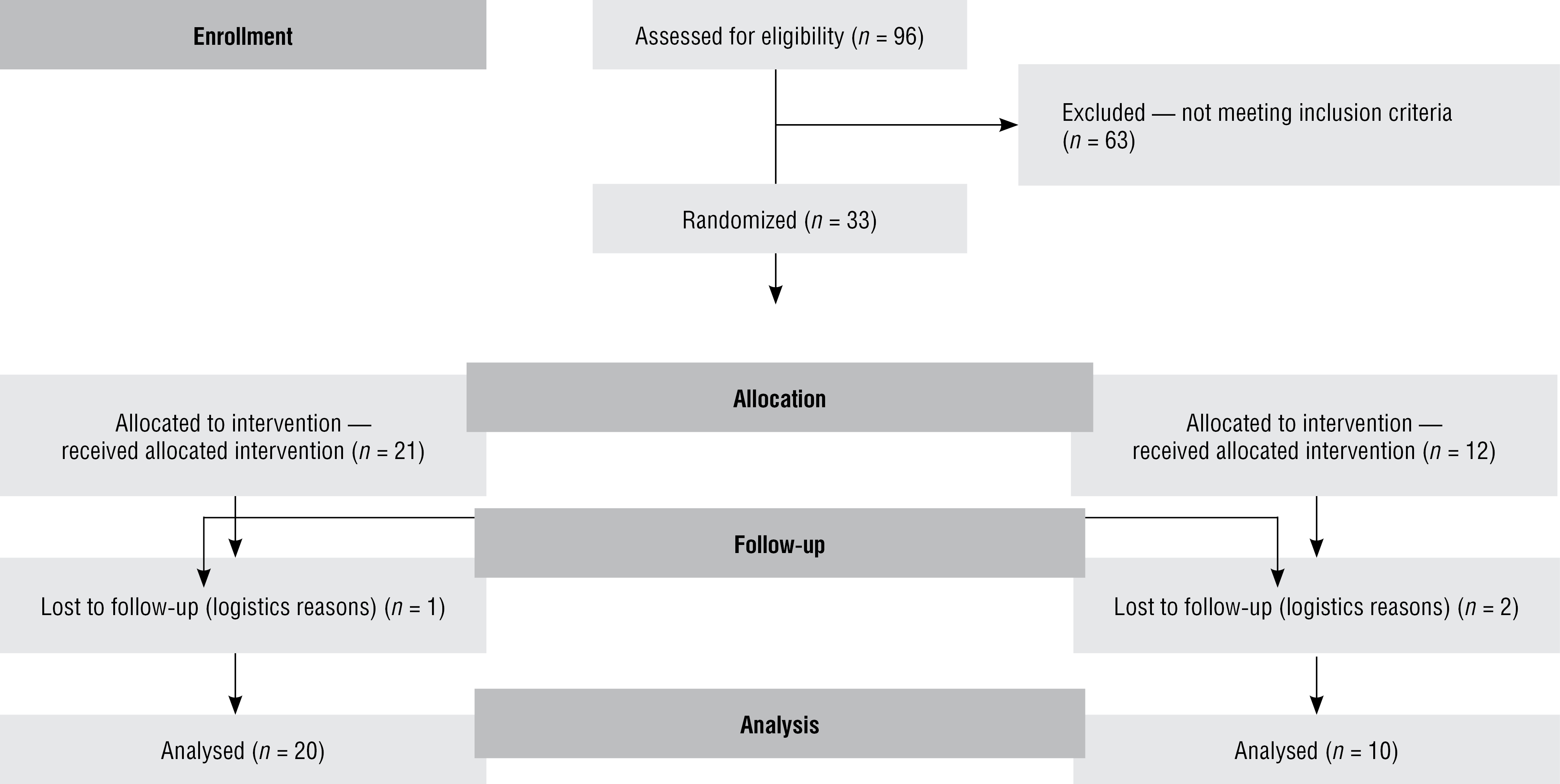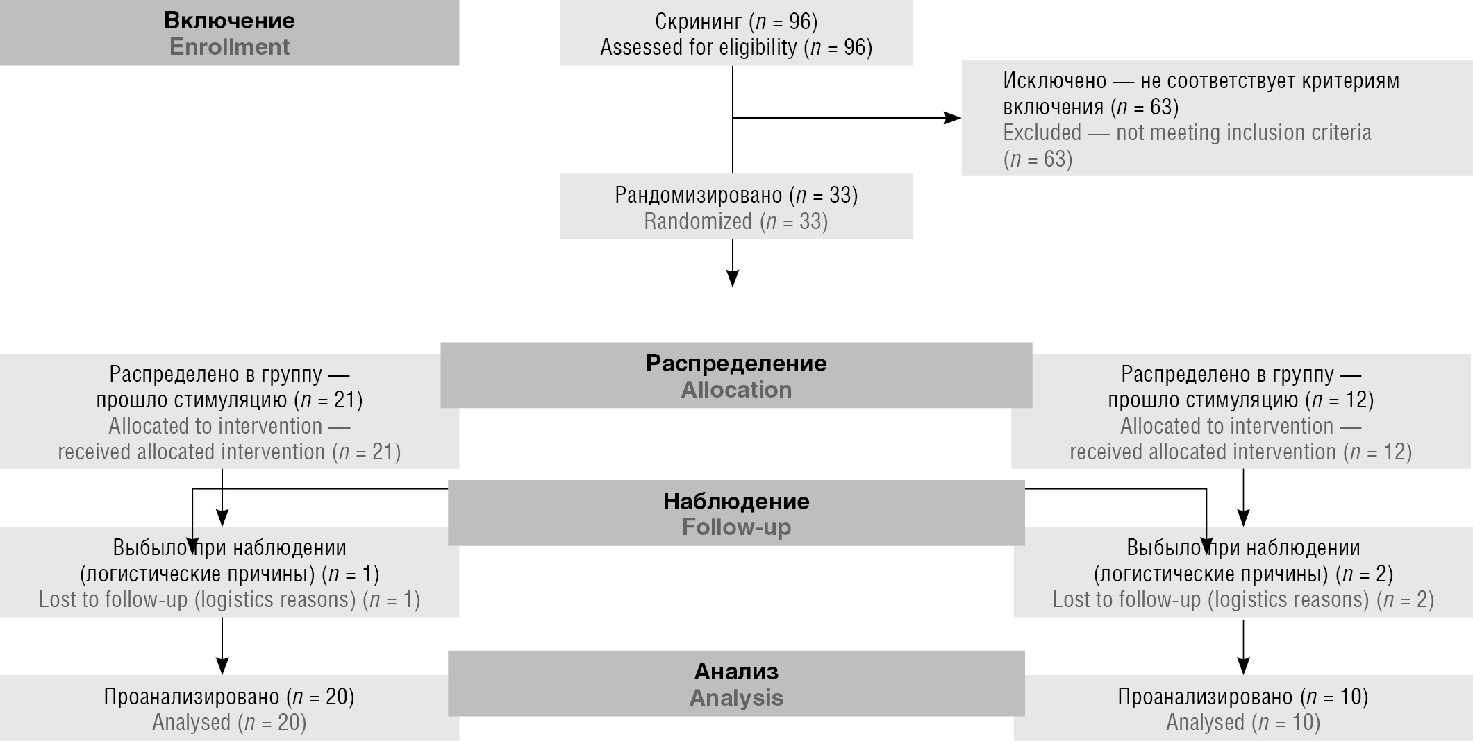 Скрининг на участие в исследовании прошли 96 пациентов, из них 30 пациентов были включены в окончательный анализ (рис. 1). Обе группы не отличались статистически значимо по полу, возрасту, выраженности неврологической симптоматики или показателям когнитивных тестов (табл. 1).