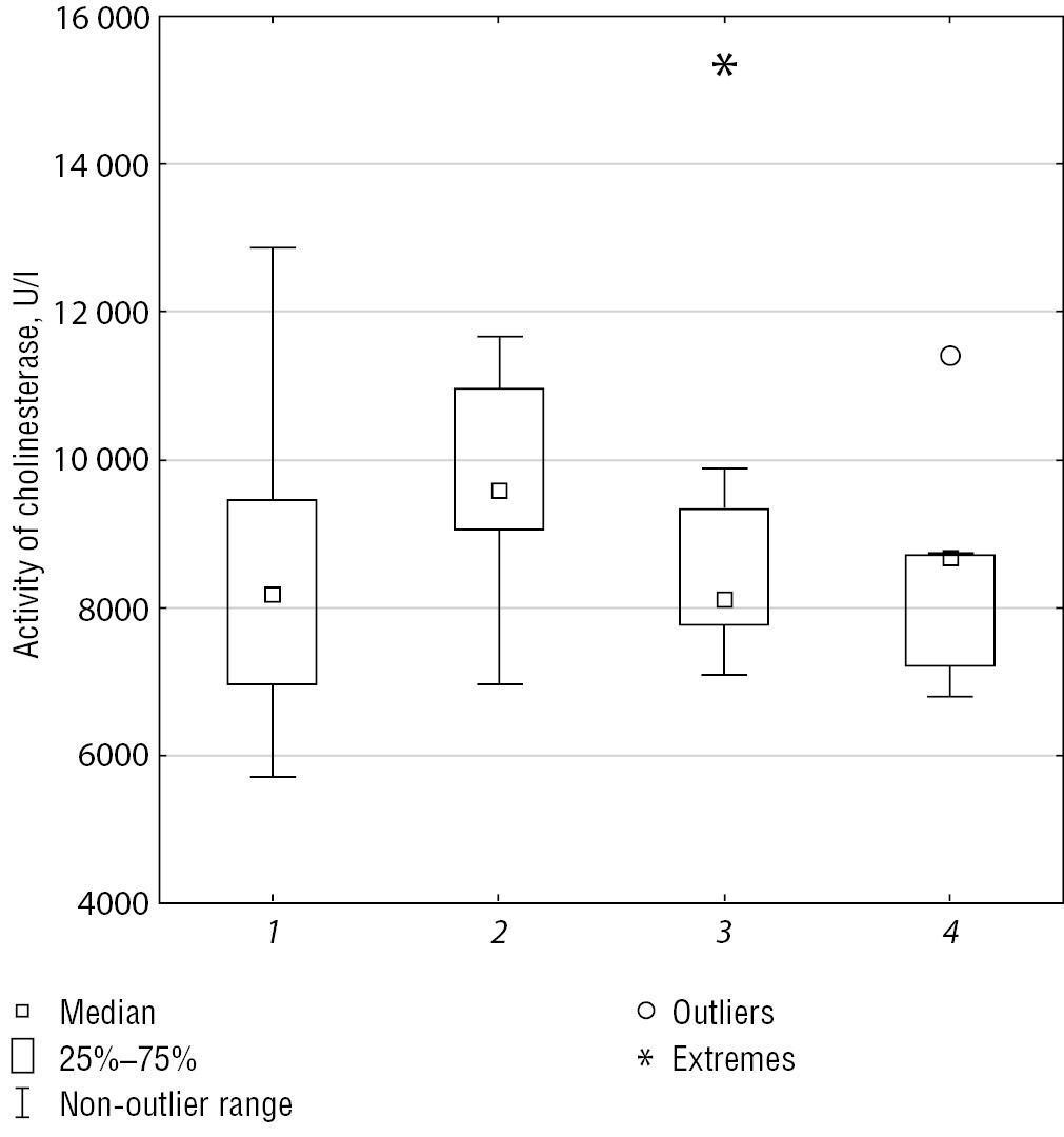 Specifically, the level of peripheral serum cholinesterase (pChE) is an available indicator whose level changes may serve as a predictor of the development and progression of neurodegenerative processes associated with cognitive impairment [8]. PChE is an α-glycoprotein synthesized by the liver and existing in two main forms: acetylcholinesterase (AChE) and butyrylcholinesterase (BChE). In blood, the ratio of BChE to AChE is 412.5 : 1, but AChE is the more active enzyme [9]. In clinical practice, the assessment of BChE and pChE levels is used to diagnose organophosphate poisoning [10].