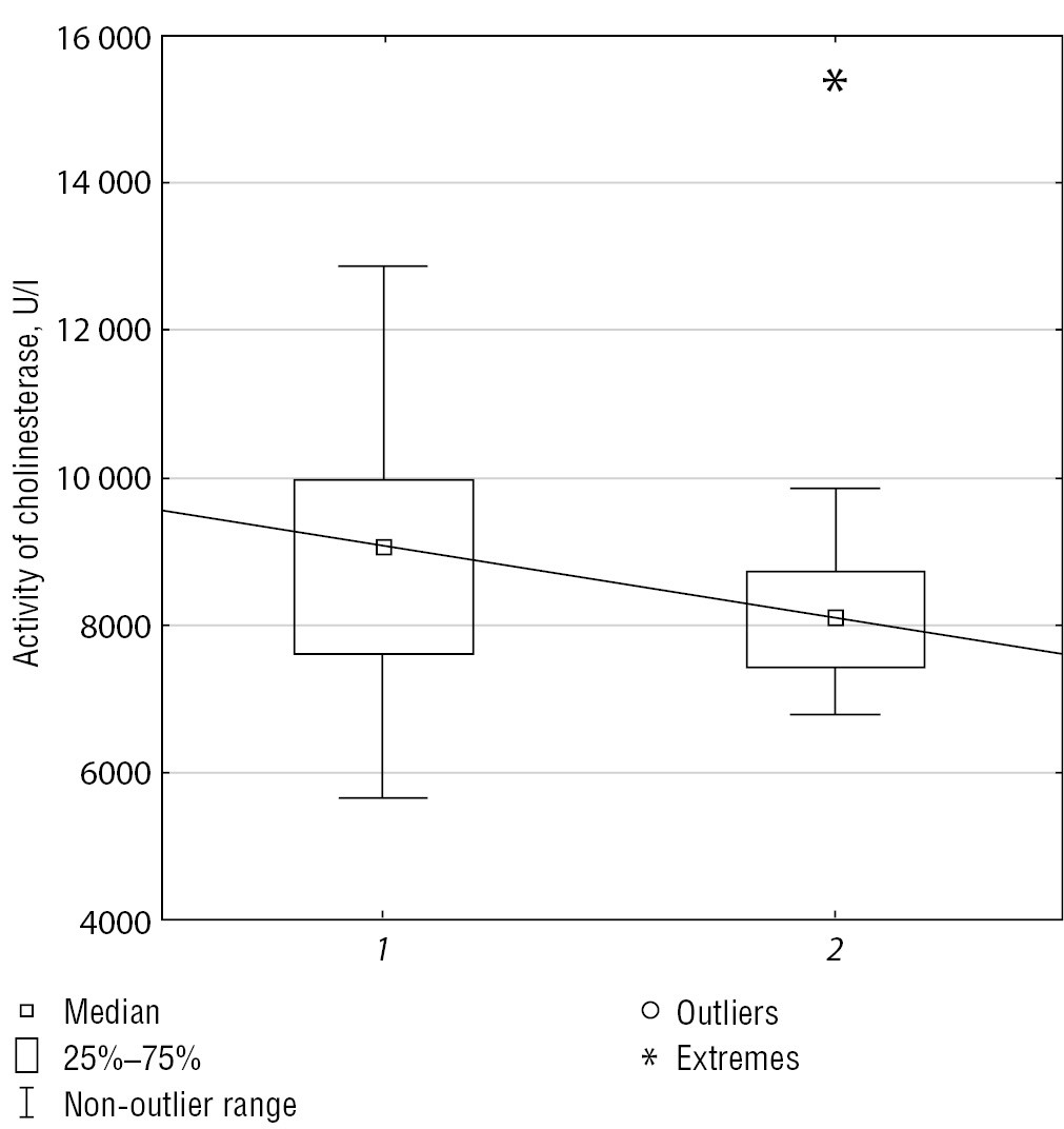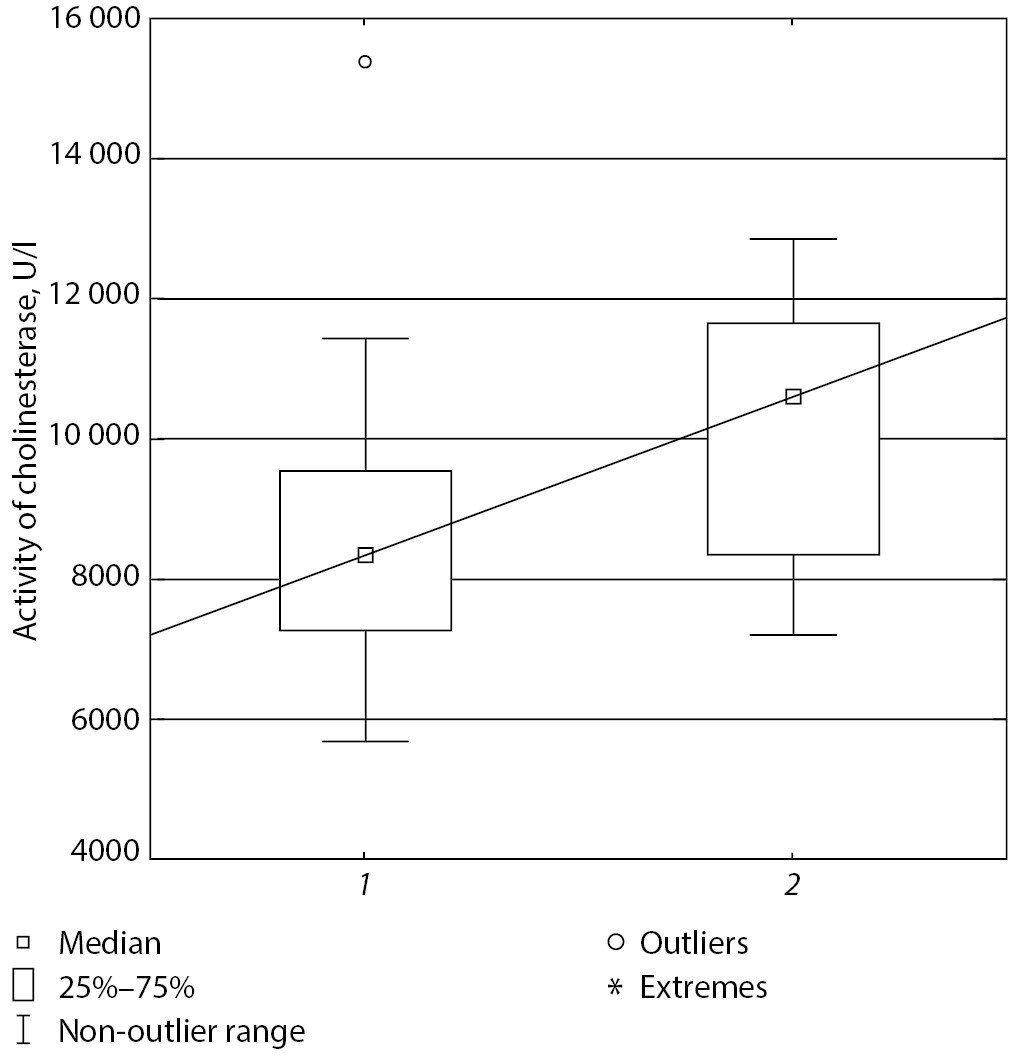Fig. 4. Cholinesterase level in group of patients without T2DM (1) and with T2DM (2).