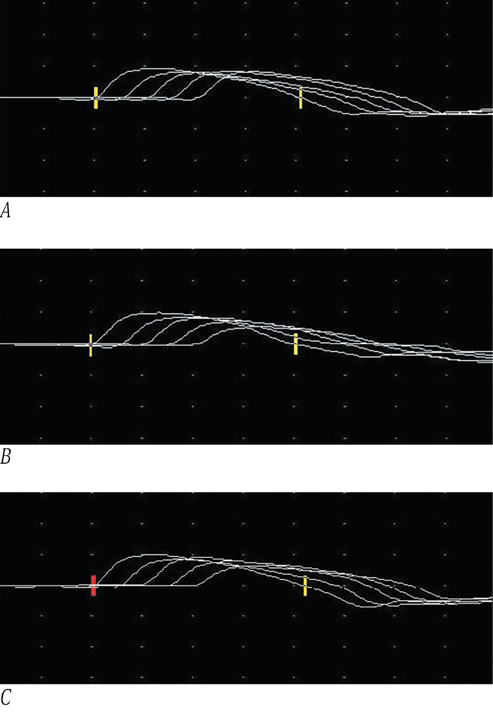 А — m. deltoideus dextra, первичный декремент амплитуды (1–5) 35%; В — постактивационное облегчение; С — постактивационное истощение.