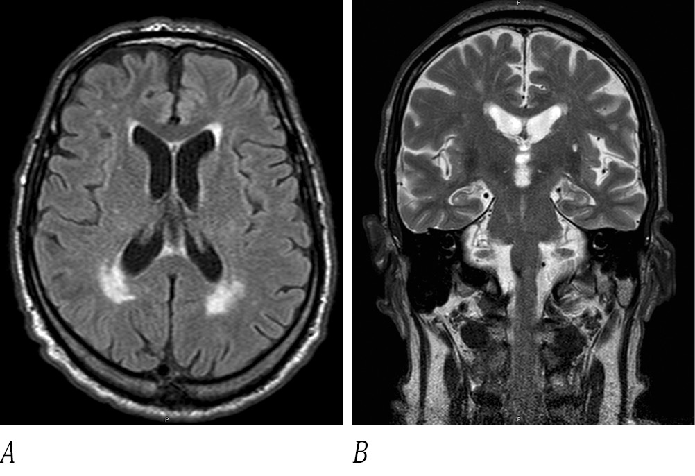 Fig. 3. Periventricular hyperintensity of vascular origin on T2 (A) and FLAIR (B) MRI scans of the patient's brain.