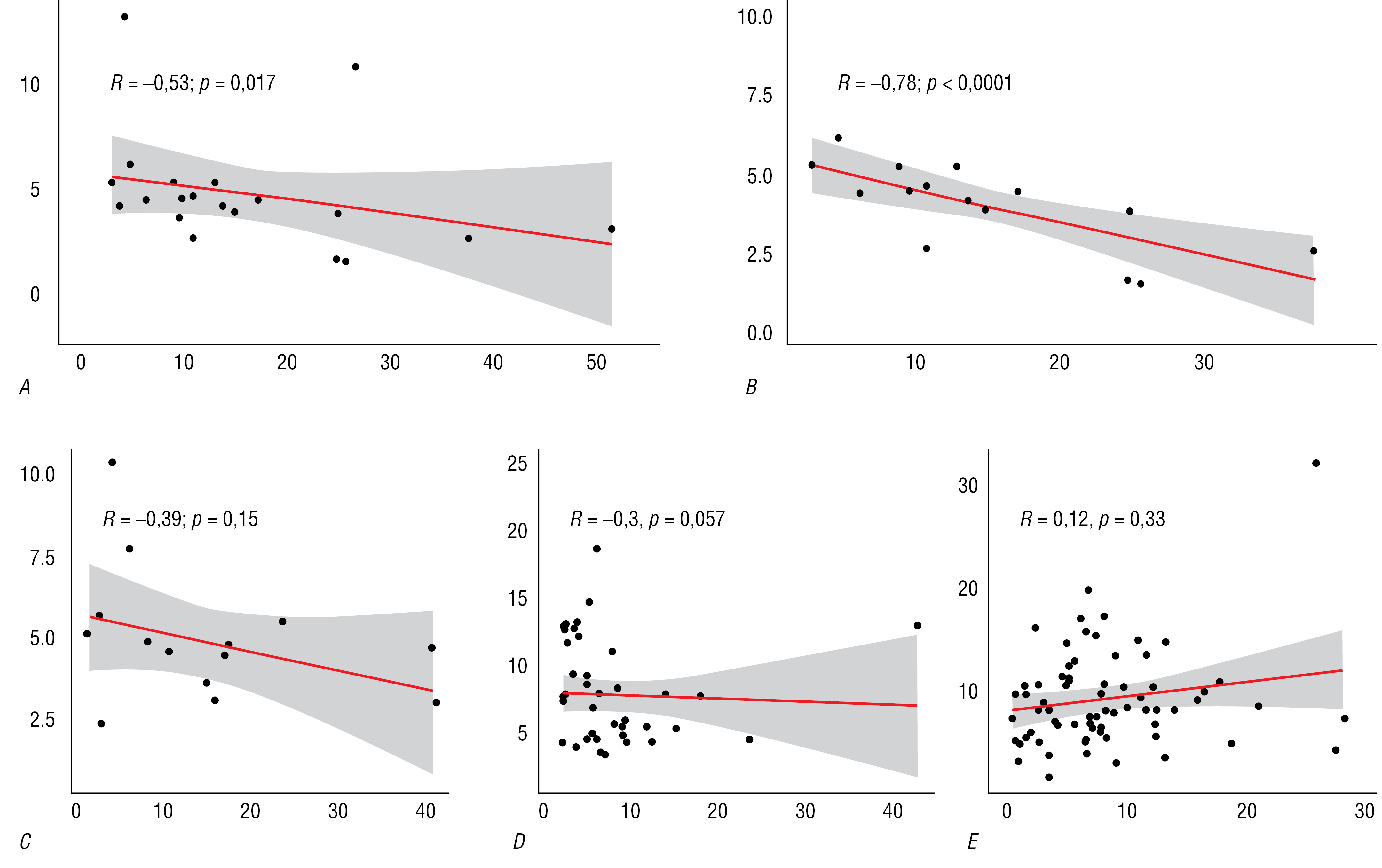 Корреляция между уровнем α-синуклеина в CD45+-клетках и активностью GСase в крови пациентов групп все_GBA-БП (A; n = 25), GBA-БП (В; n = 15), GBA-носителей (С; n = 15), сБП (D; n = 40) и группы контроля (E; n = 68). По осям абсцисс — уровень α-синуклеина, нг/мл, по осям ординат — активность GСase, мМ/л в час.