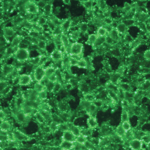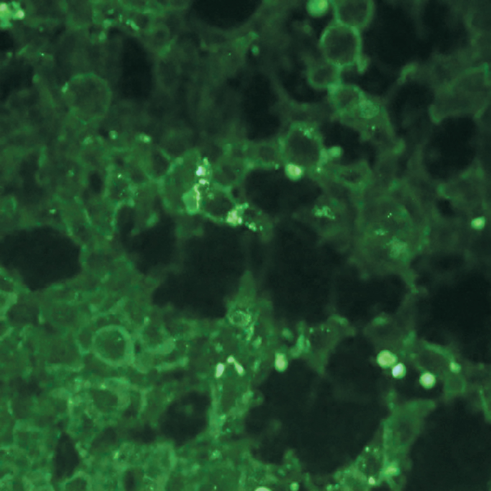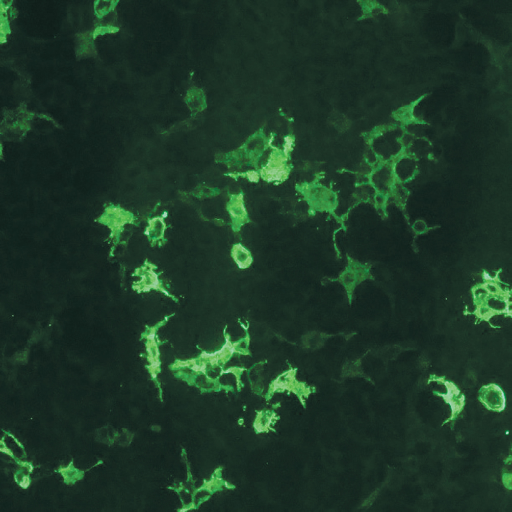 Transfection can be classified as transient and stable. Transient transfection is a relatively rapid and simple technique, but stable transfection provides a higher level of sensitivity. Flow cytometry, confocal microscopy, and indirect immunofluorescence are used to detect autoantibody and protein binding, with non-transfected cells used as a negative control [23]. In addition, some commercially available substrates contain a pre-optimized mixture of transfected and non-transfected cells of the same line to facilitate visual assessment of reaction results.