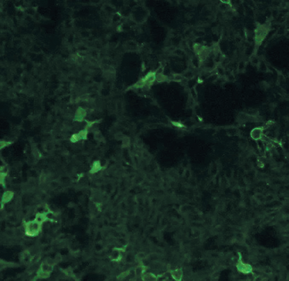 Fig. 2. Positive test result for anti-AQP4 antibodies. Indirect immunofluorescence with antigen cell presentation, 1 : 10 titer, fluorescence intensity ++.