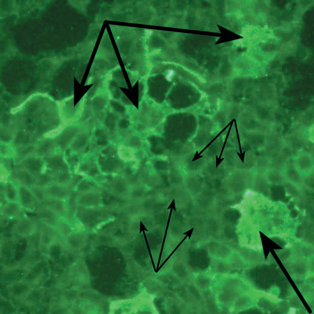 4. Fig. 3. Positive test result for anti-AQP4 antibodies. Indirect immunofluorescence with antigen cell presentation, 1 : 320 titer, fluorescence intensity ++ (thick arrow) with areas of nonspecific fluorescence (thin arrows).