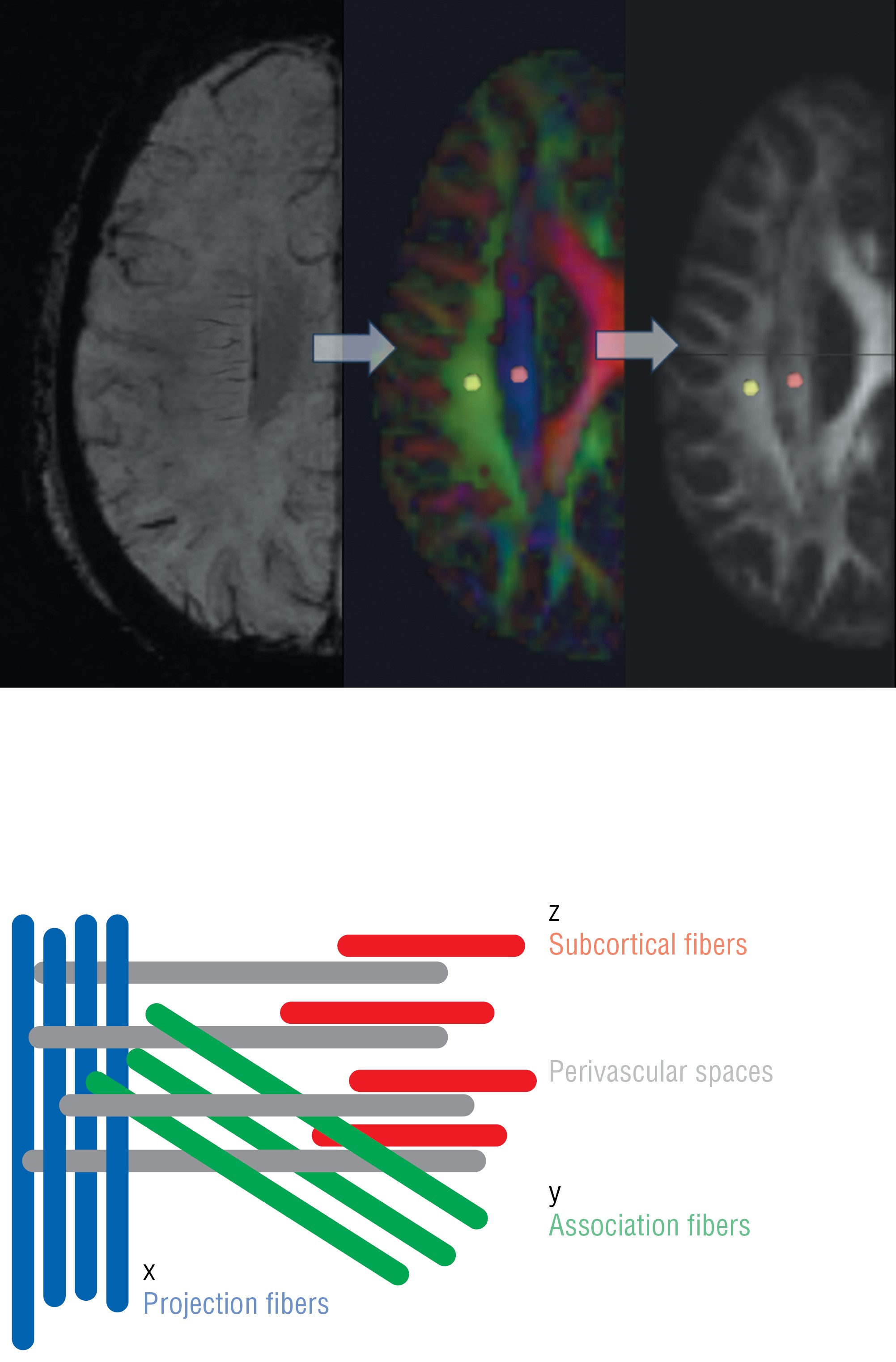 The region of interest (ROI) highlighted in yellow corresponds to the association fibers represented by the superior longitudinal fascicle. The ROI highlighted in red corresponds to the projection fibers represented by the pyramidal tract (adapted from T. Taoka et al. [13]).