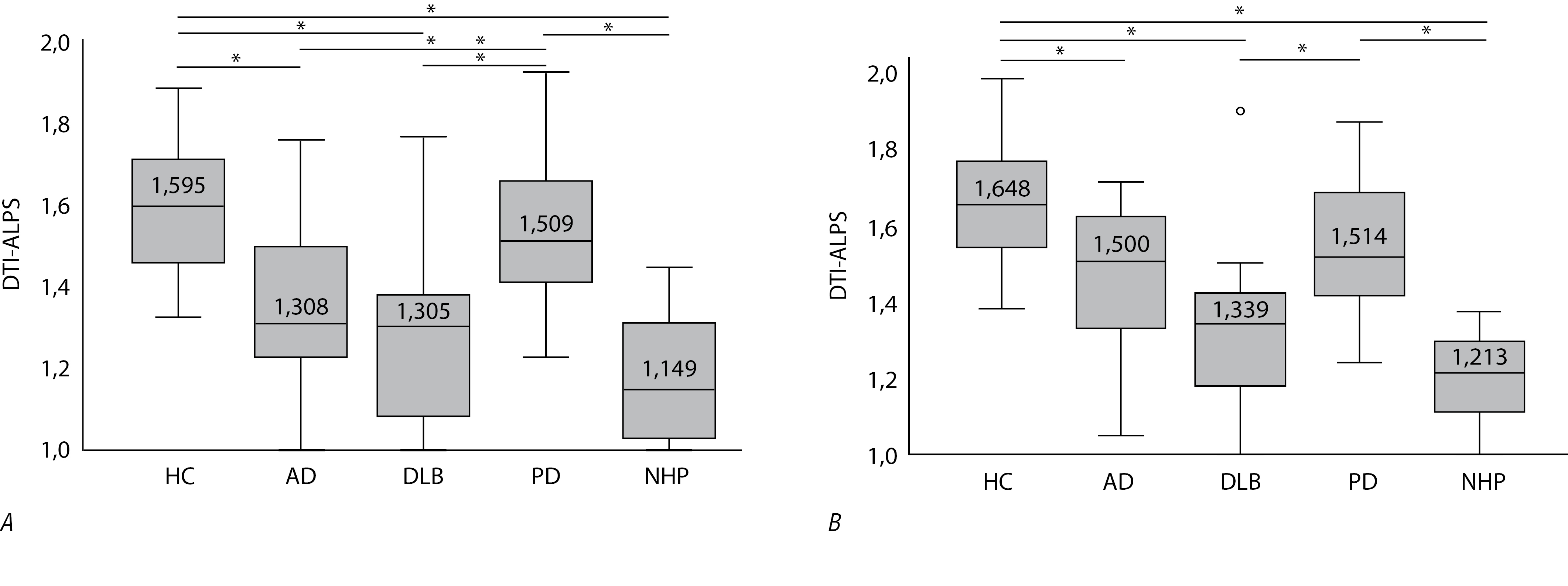 Patients with DLB and NPH had significantly lower DTI-ALPS index on both sides compared to patients with PD. Patients with AD also had significantly lower left DTI-ALPS index compared to patients with PD. On the right side, the differences were not statistically significant. In addition, patients with AD had a significantly higher right DTI-ALPS index compared to patients with NPH. On the left side, the differences were not statistically significant. Patients with DLB and NPH were not statistically significantly different.