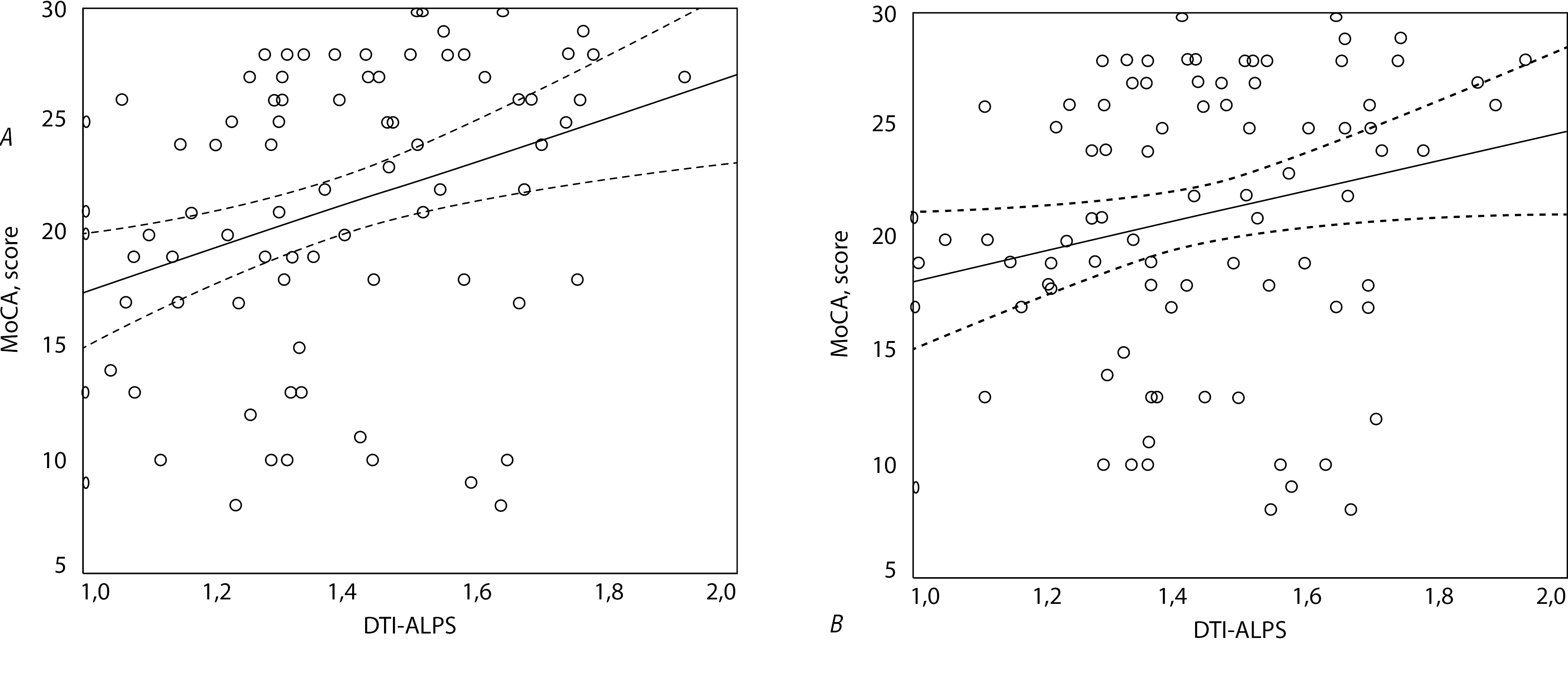 The correlation found between DTI-ALPS index and the severity of cognitive impairment (MoCA) is consistent with the data from the pivotal study by T. Taoka et al. [13] and the study by T. Lian et al. [22] described above. In a similar study, B.W. Williams et al. also reported a significant correlation between DTI-ALPS index and cognitive tests such as the Boston Naming Test [23]; Digit Span Test [24]; Route Construction Test, Part A [25, 26].