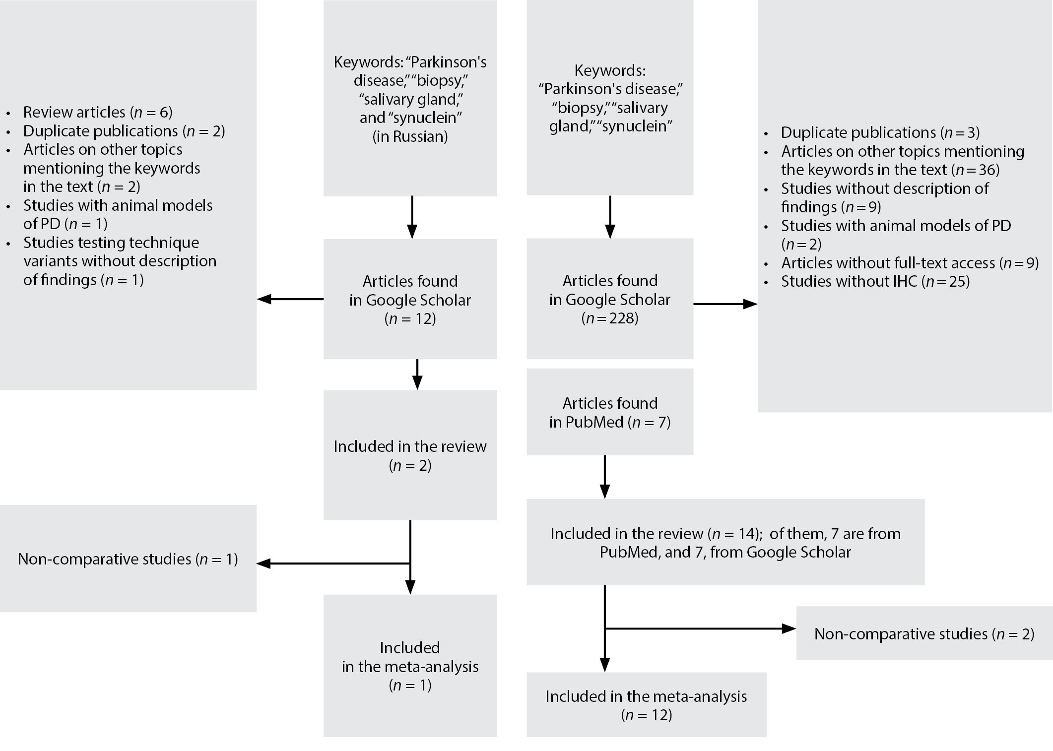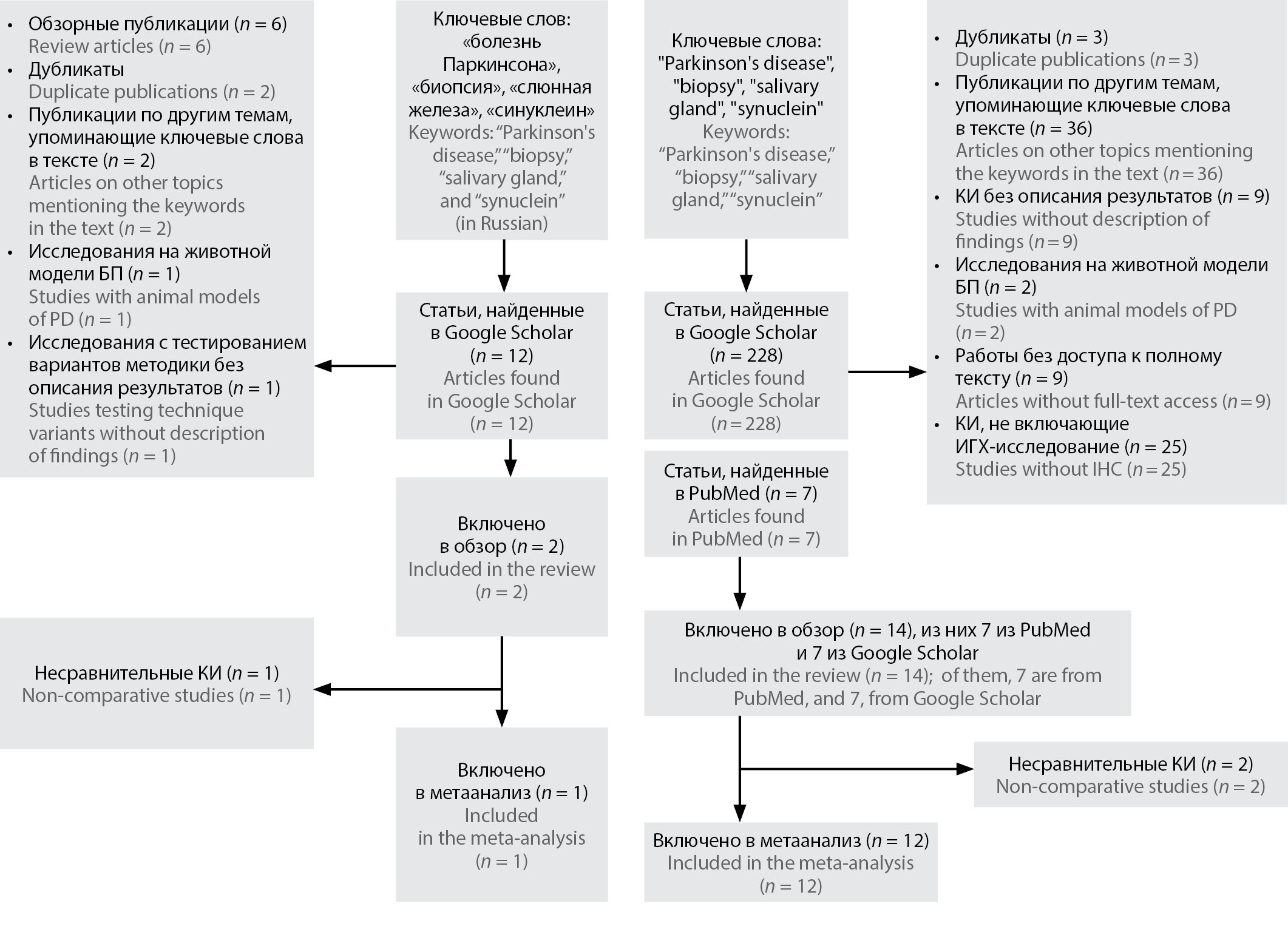 В систематический обзор включались все КИ на английском и русском языках, посвящённые изучению детекции α-syn в ткани СЖ пациентов с верифицированным диагнозом «болезнь Паркинсона», вне зависимости от того, прижизненно или посмертно была проведена диагностика. Поиск осуществлялся с использованием баз данных PubMed и Google Scholar по ключевым словам: «болезнь Паркинсона», «биопсия», «слюнная железа», «синуклеин», «Parkinson's disease», «biopsy», «salivary gland», «synuclein». Публикации без доступа к полному тексту не рассматривались в качестве материала для обзора в связи с невозможностью анализа информации о дизайне и результатов исследования. Дублирующие публикации, а также статьи, посвящённые исключительно методике проведения гистологического исследования биопсий СЖ у пациентов с БП, без статистической обработки и анализа результатов не включались в обзор. Для проведения метаанализа из пула публикаций, удовлетворяющих перечисленным выше критериям, отбирали публикации по сравнительным КИ с участием пациентов с БП и группы контроля.