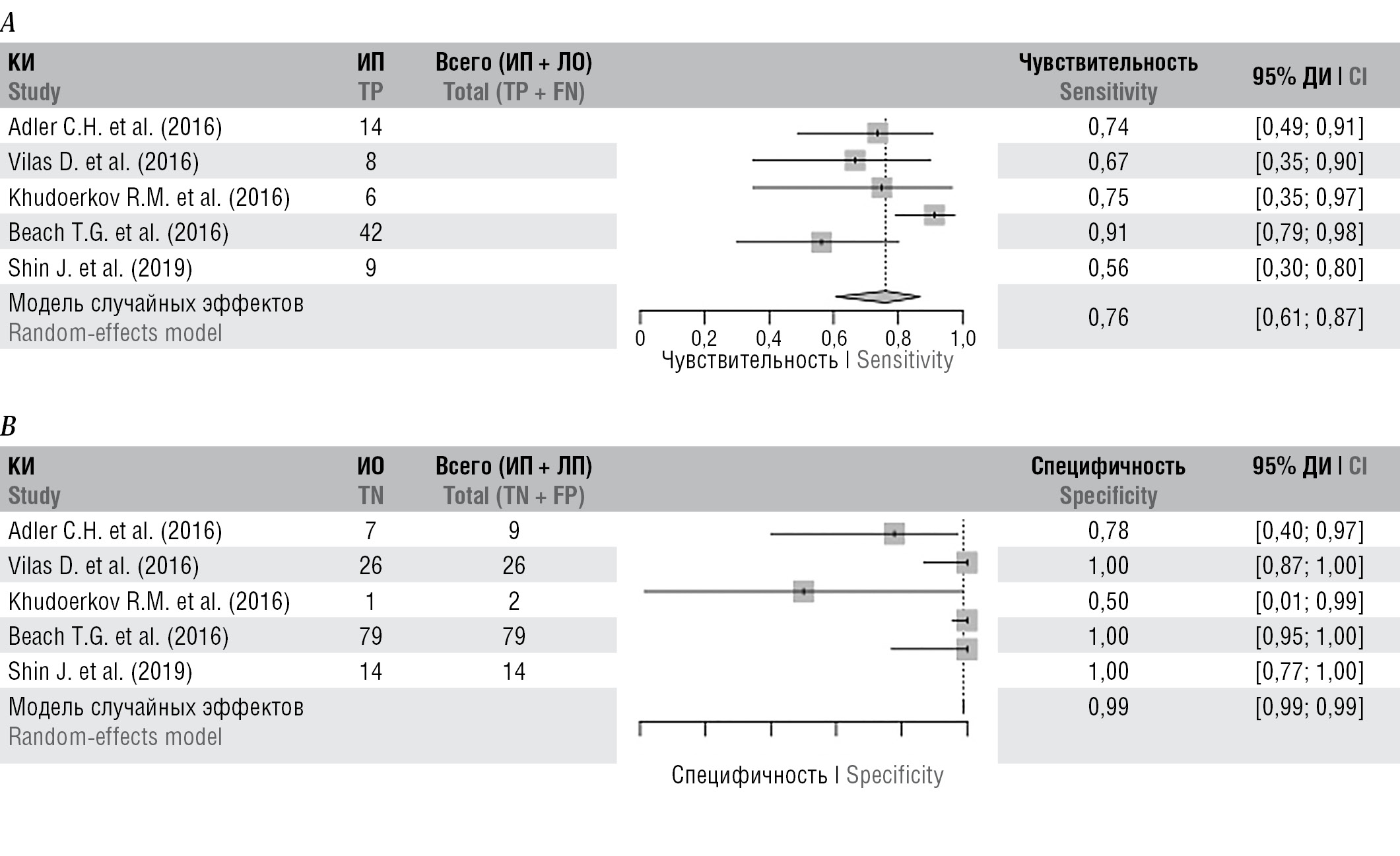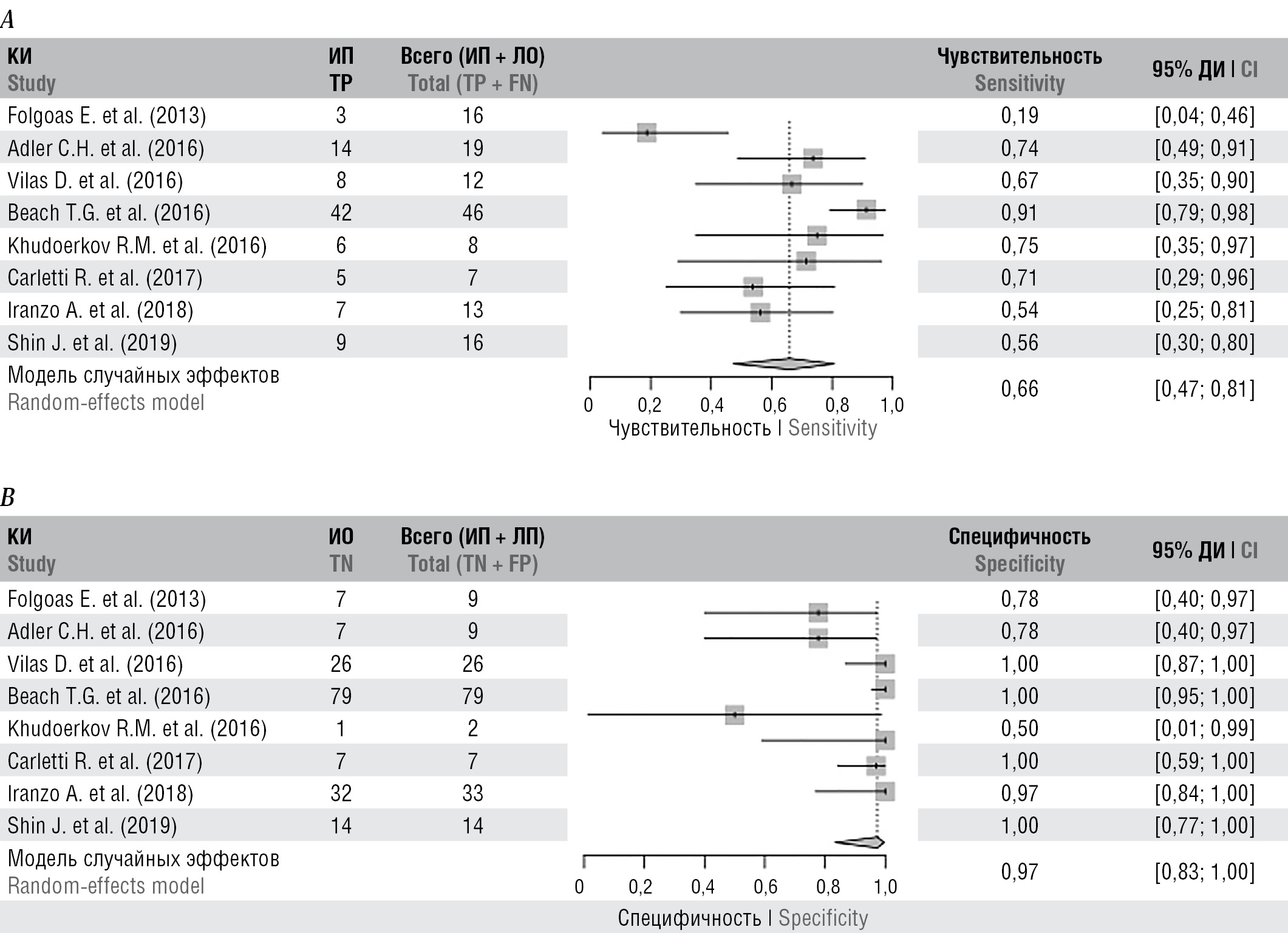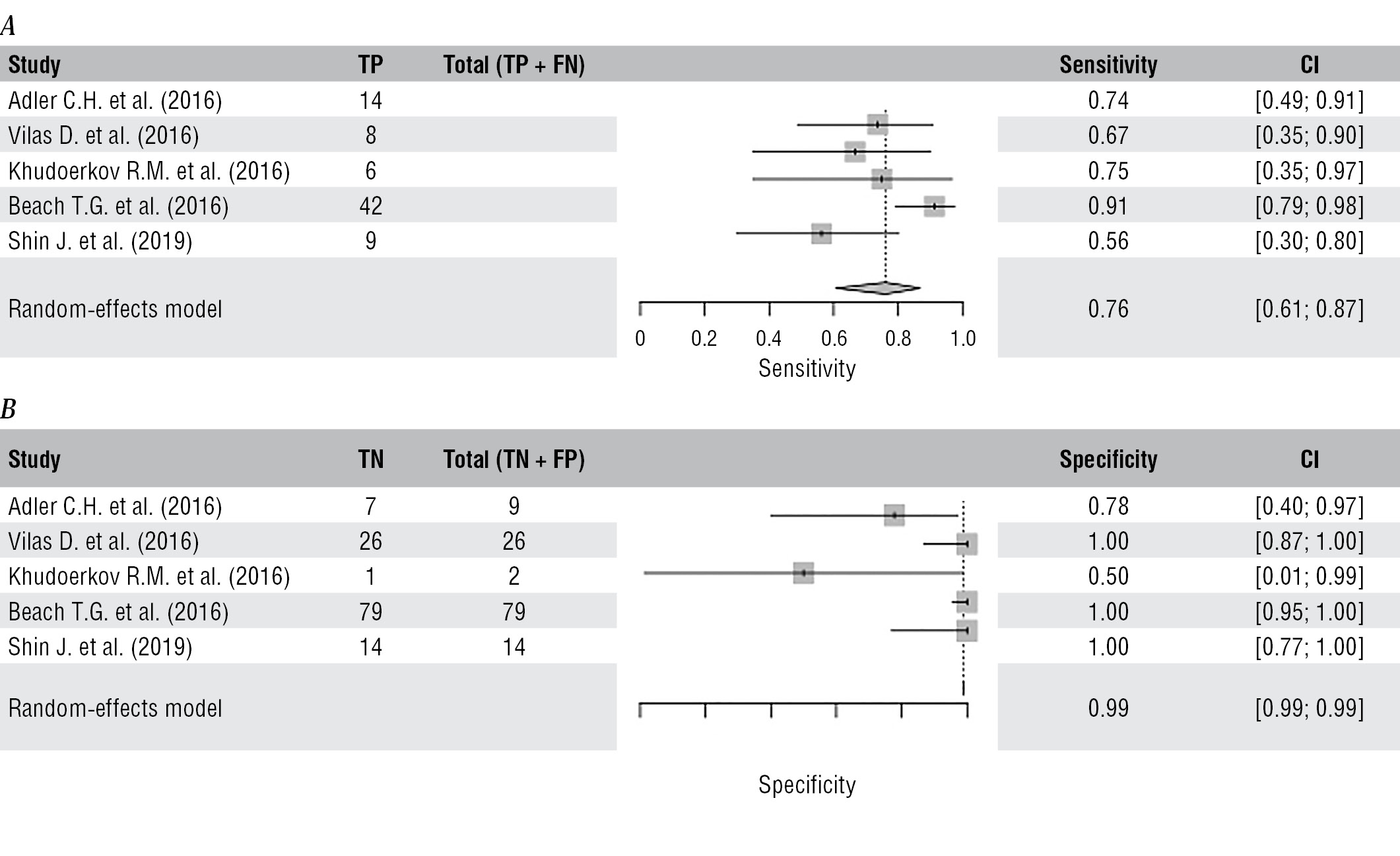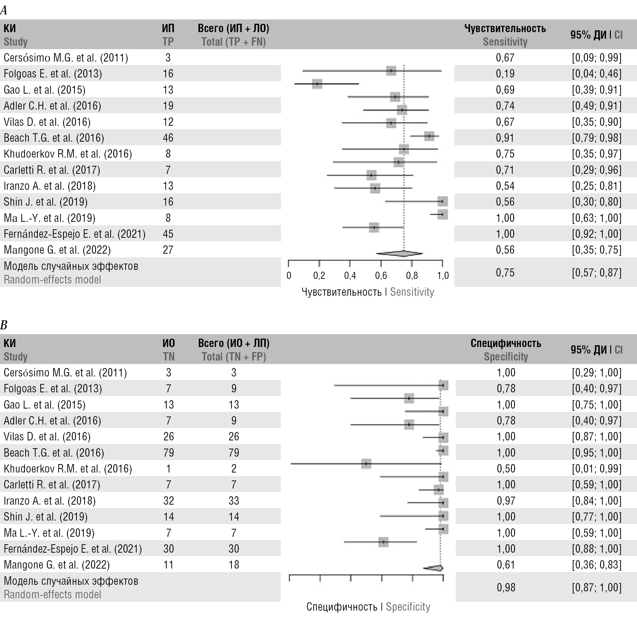 Рис. 4. Объединённая чувствительность (А) и специфичность (В) по сравнительным КИ для методов детекции α-syn в СЖ пациентов с БП и в группе контроля, в которых использовались АТ к pS129-α-syn и крупные СЖ в качестве материала для исследования.