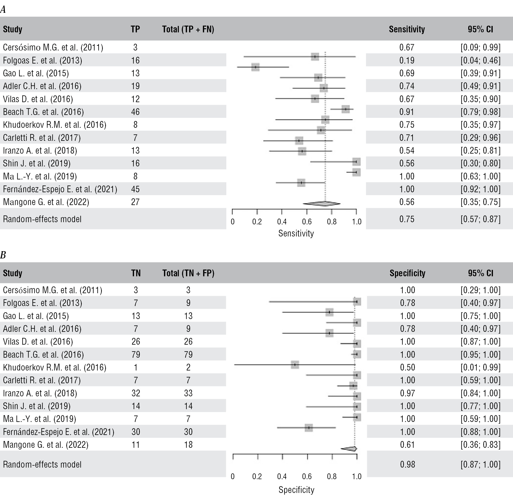 Объединённая чувствительность по всем 13 сравнительным КИ с группой контроля вне зависимости от вида использованных АТ к α-syn и материала для исследования (то есть с учётом всех КИ, проведённых на материале мелких и крупных СЖ) составила 0,749 (95% доверительный интервал (ДИ) 0,575–0; I2 = 52%), специфичность — 0,984 (95% ДИ 0,855–0,999; I2 = 0,0), DOR — 188,33 (95% ДИ 15,42–2299,96), FPR — 0,016 (95% ДИ 0,001–0,145), PLR — 48,02 (95% ДИ 4,6–501,25), NLR — 0,255 (95% ДИ 0,14–0,46) (рис. 2).