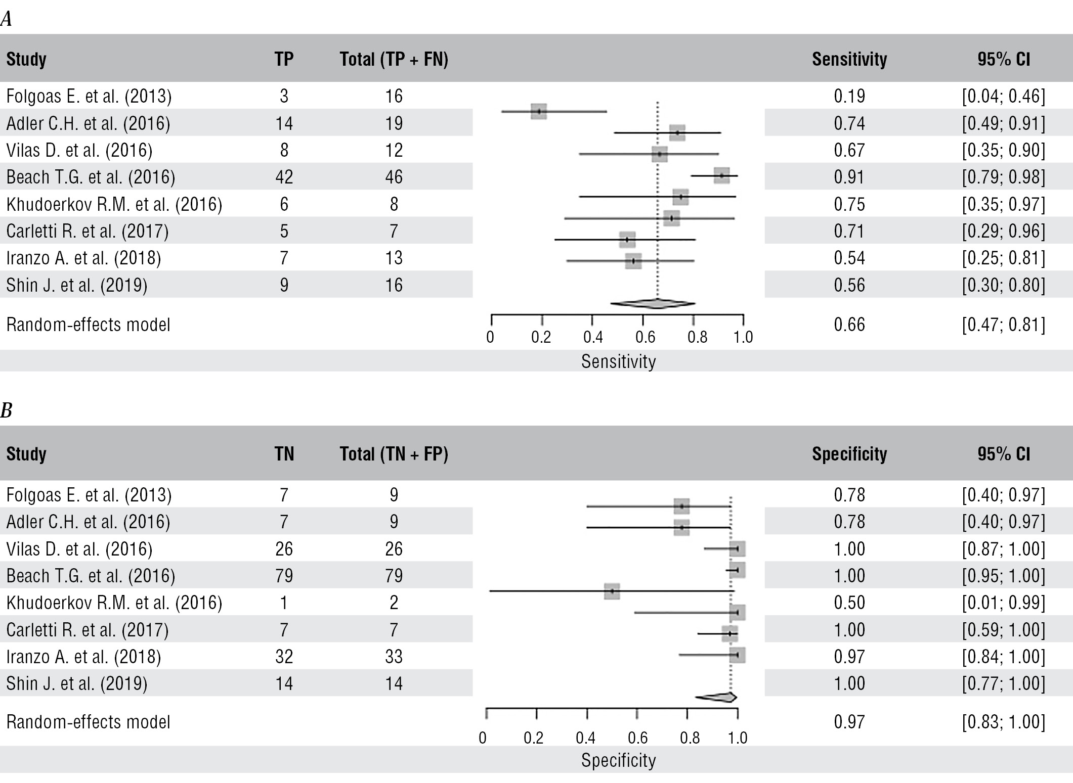 Рис. 2. Объединённая чувствительность (А) и специфичность (В) по сравнительным КИ для методов детекции α-syn в СЖ пациентов с БП и в группе контроля вне зависимости от типа использованных АТ к α-syn.
