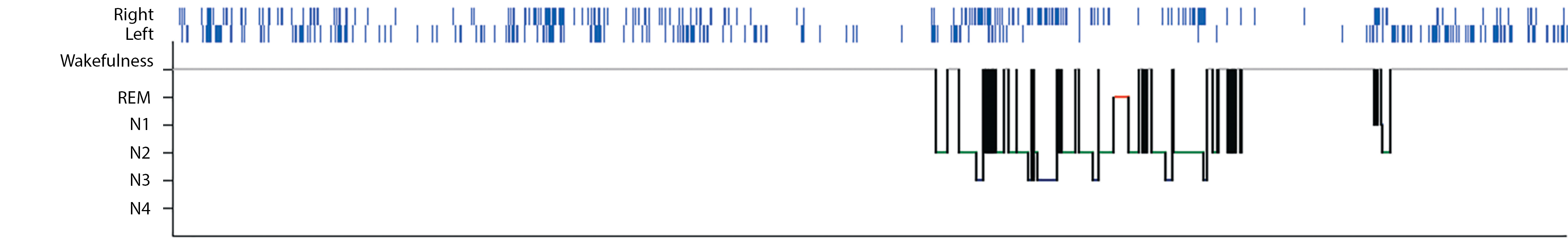 Fig. 1. Hypnogram with EA labels in the right (top row) and left (bottom row) temporal regions.