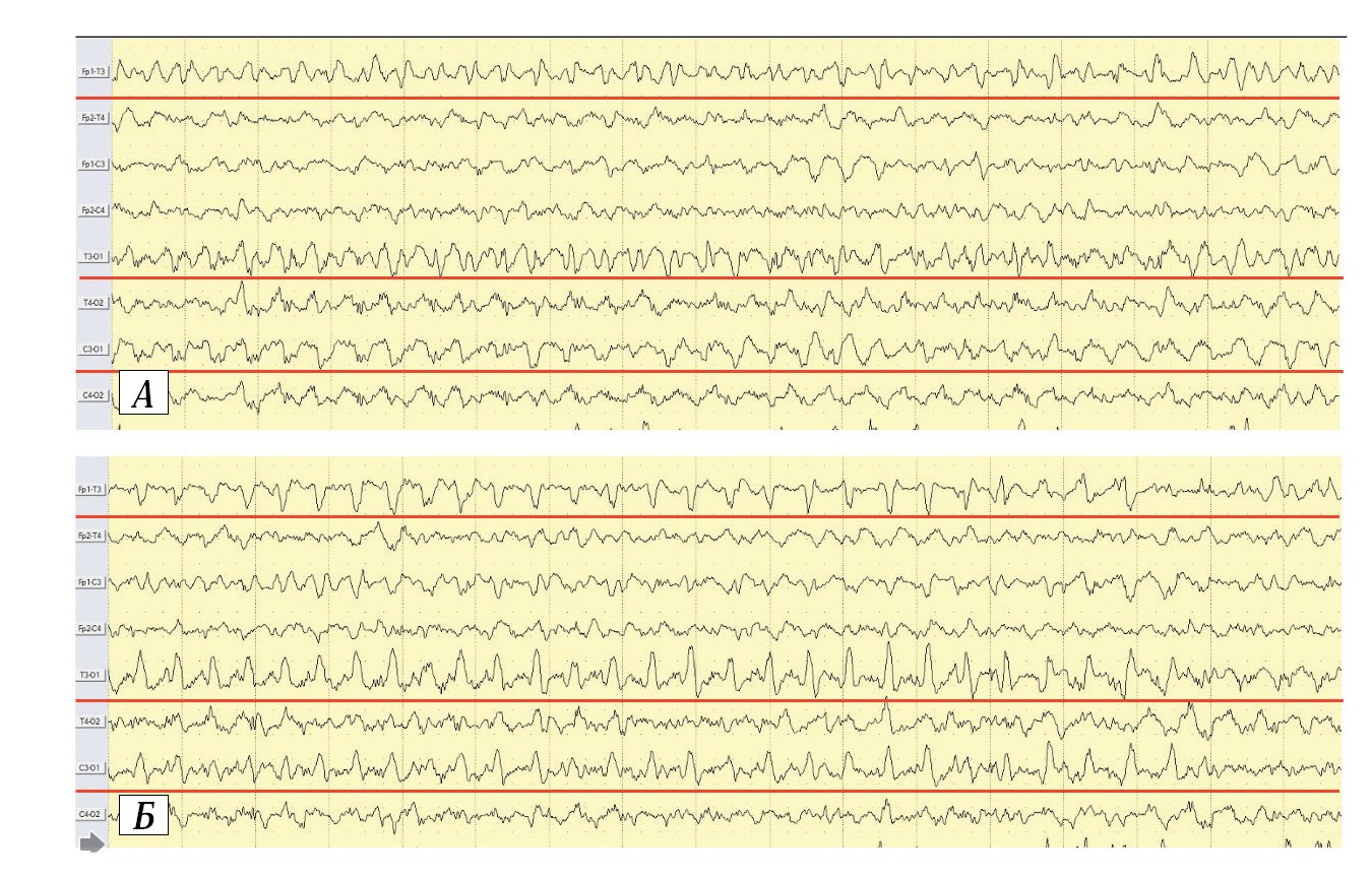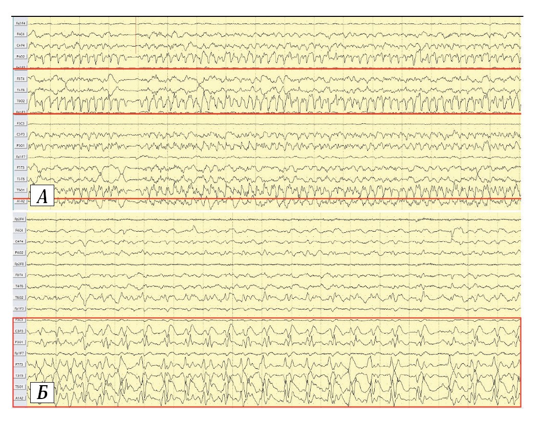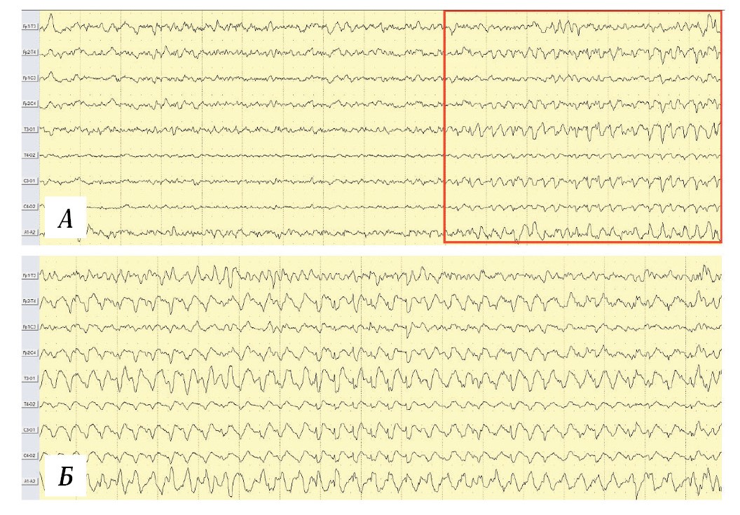 Регистрируется диффузный иктальный паттерн с акцентом в левом затылочном регионе. А — начало иктального паттерна; Б — эволюция иктального паттерна. Красной рамкой выделено начало регистрации иктального паттерна. Биполярный продольный монтаж. Чувствительность — 7 мкВ/мм.