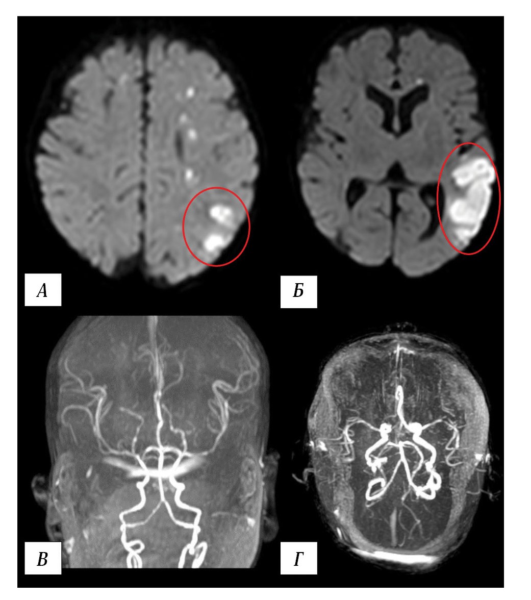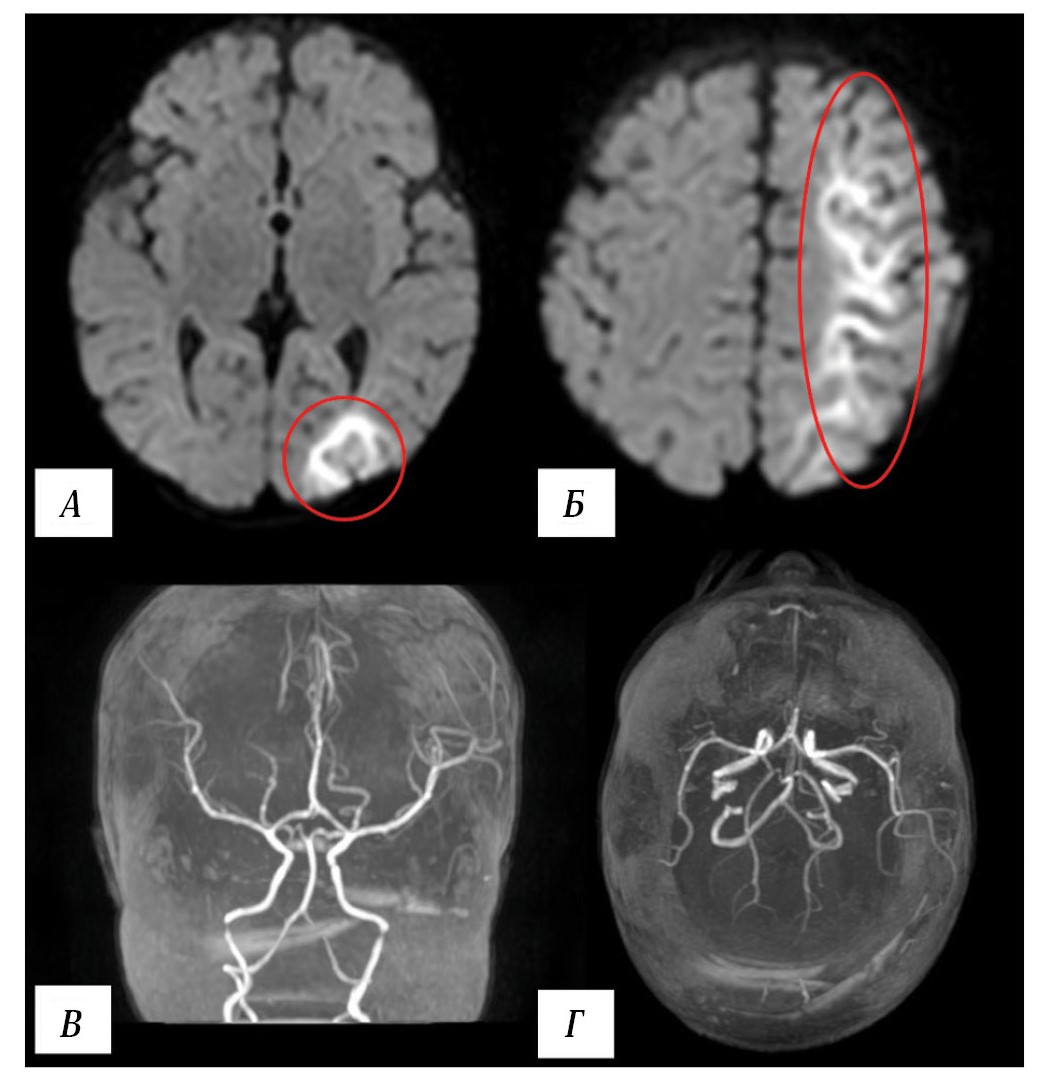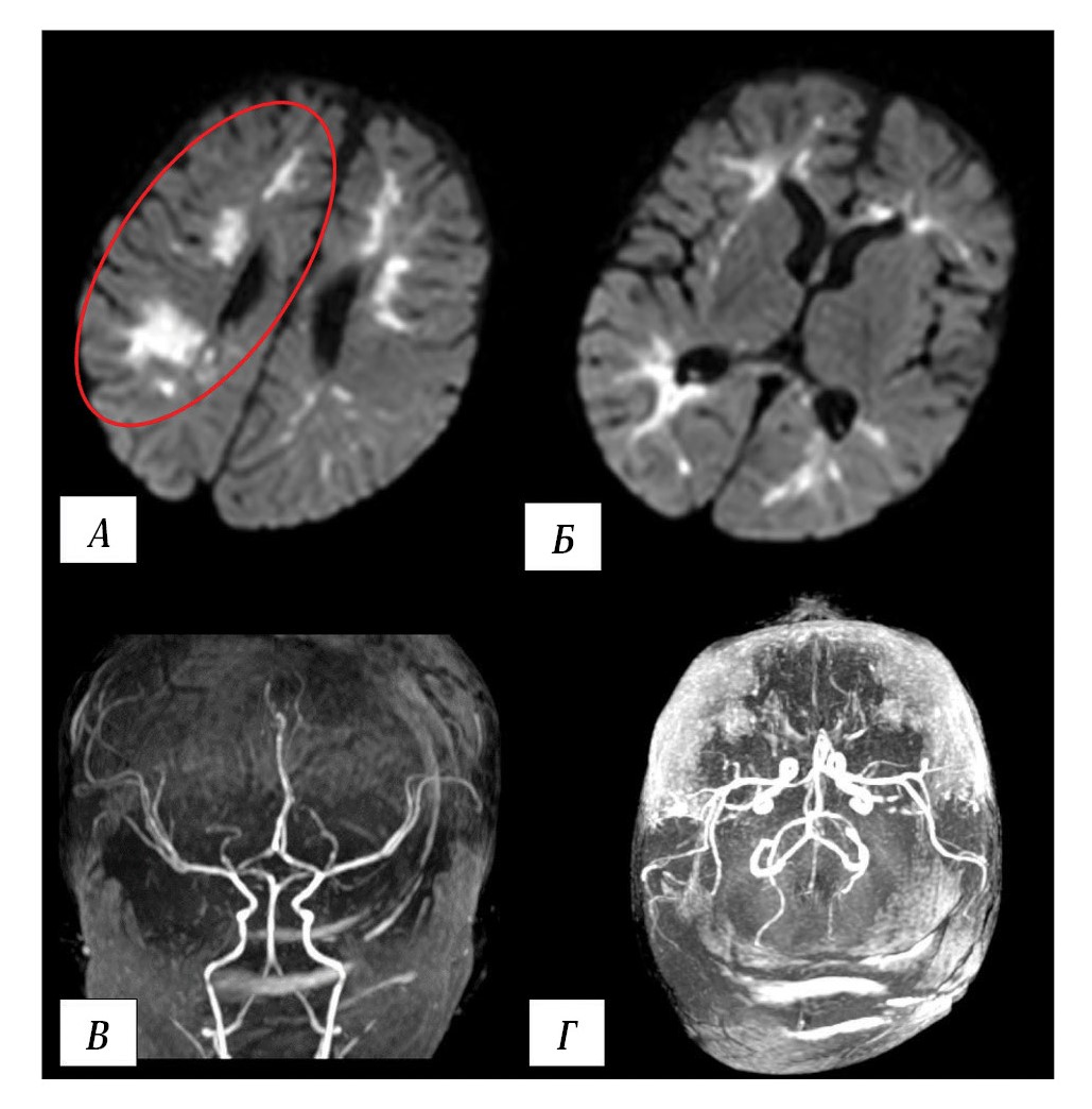А, Б — МРТ головного мозга. Диффузно-взвешенные изображения (ДВИ), аксиальная проекция. МР-картина инфаркта водораздела в левом полушарии (в красном овале). В, Г — МР-ангиография, 3D-реконструкция. Кровоток по интракраниальным артериям головы не нарушен.