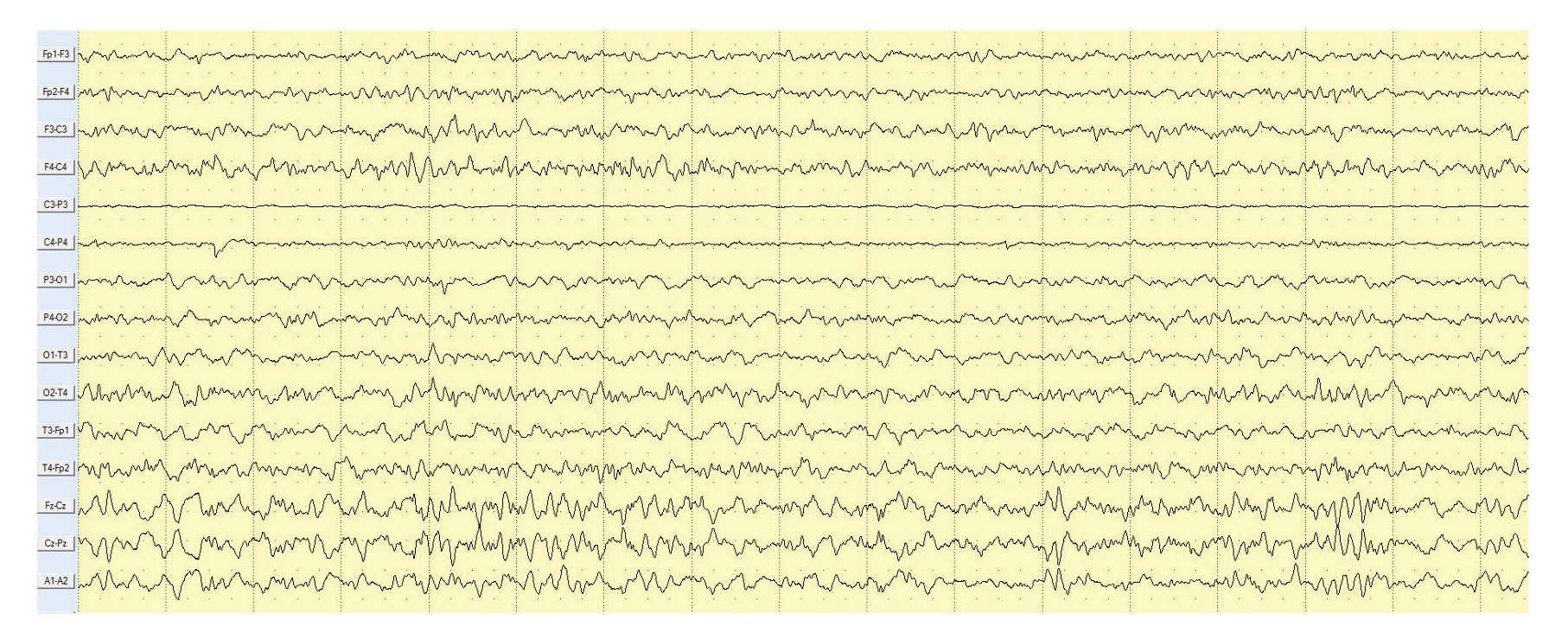 Регистрируется диффузное угнетение корковой ритмики. Биполярный продольный монтаж. Чувствительность — 3 мкВ/мм.