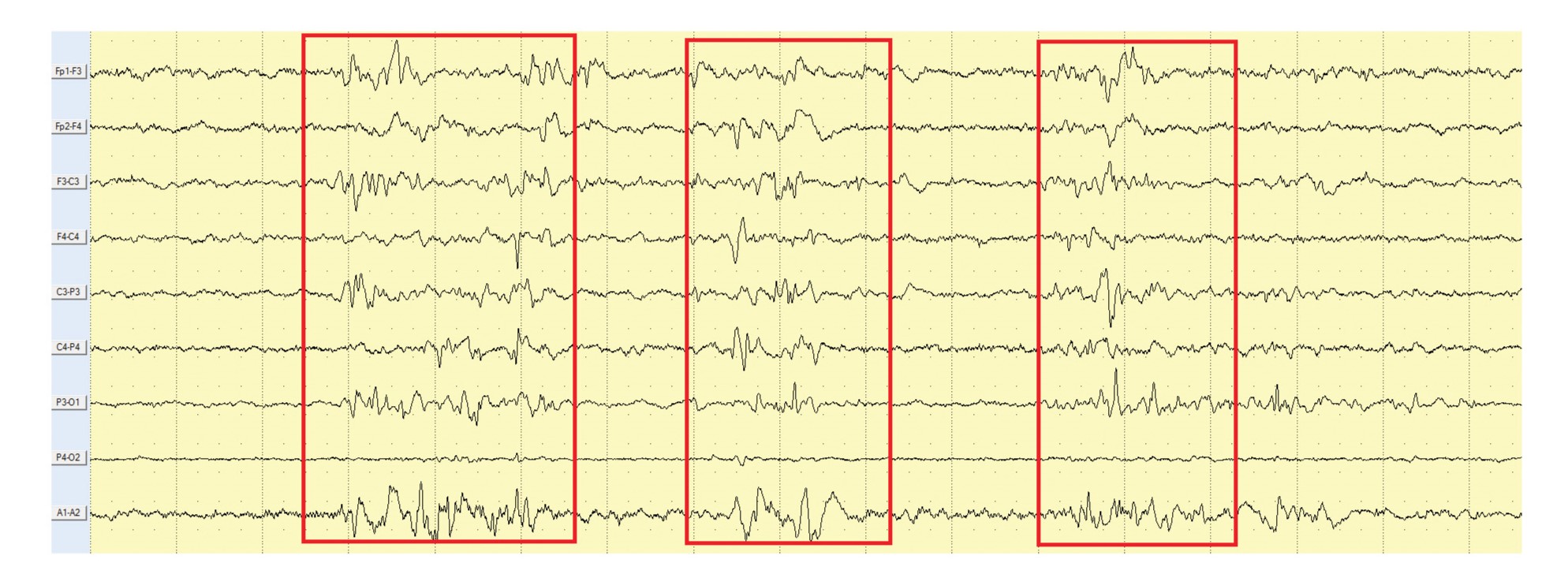 ЭЭГ-паттерн «высокоэпилептиформная вспышка–подавление». Биполярный продольный монтаж. Чувствительность — 3 мкВ/мм. Красными рамками выделены вспышки медленных волн с включением спайкового компонента.