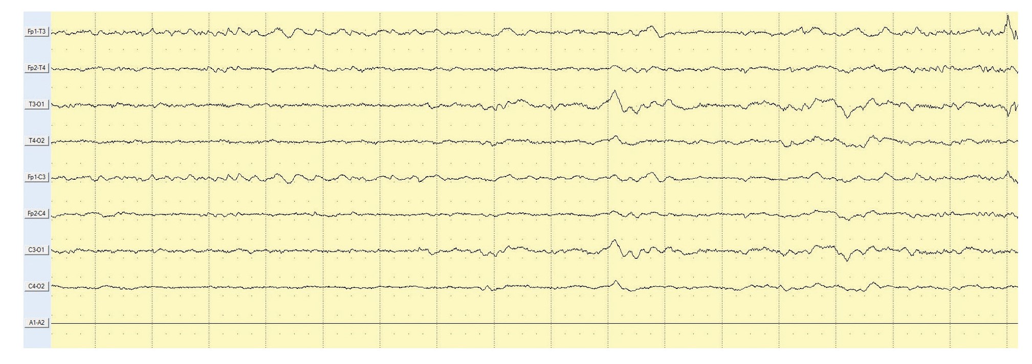 Фоновая ритмика представлена диффузными медленными волнами. Иктальные ЭЭГ-паттерны не регистрируются. Биполярный продольный монтаж. Чувствительность — 5 мкВ/мм.