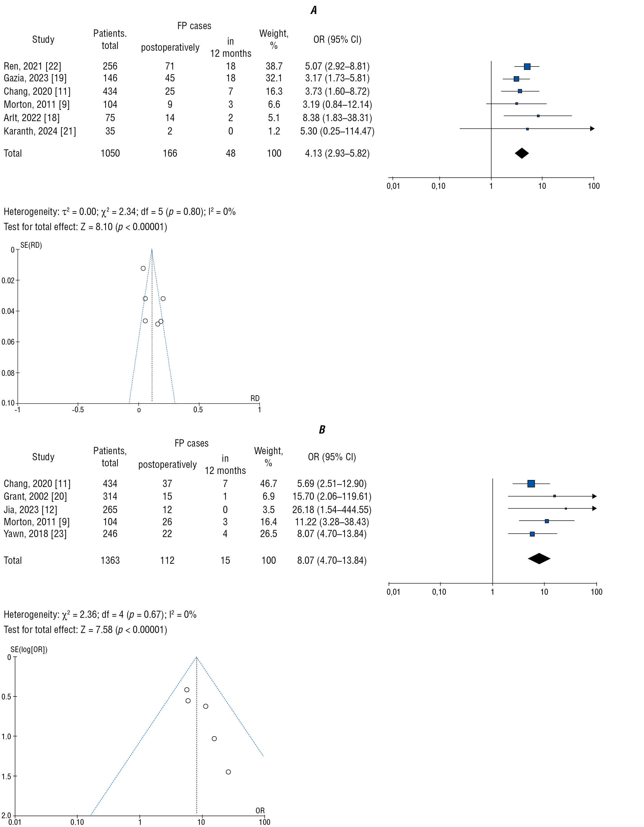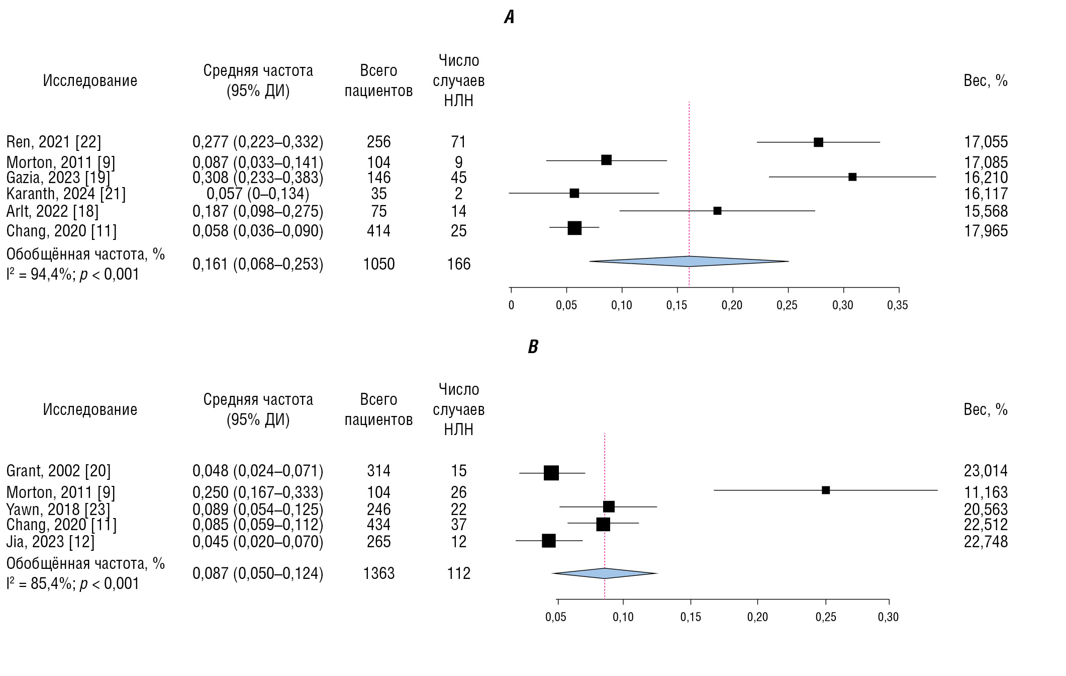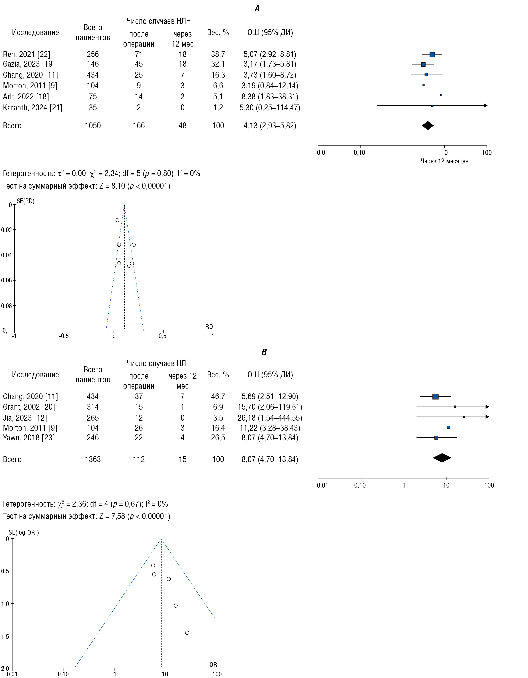 Рис. 4. Результаты метаанализа оценки функции ЛН через 12 мес после операции у пациентов с ранней (А) и отсроченной (В) послеоперационной НЛН после микрохирургического удаления ВШ.