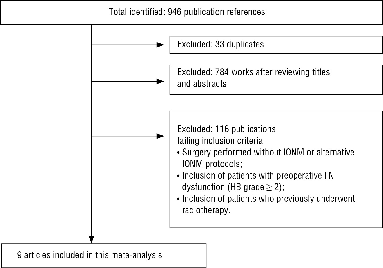 Studies were excluded from the meta-analysis if patients had preoperative FN deficits, tumor progression (recurrence), or prior VS radiosurgery. Papers involving patients with bilateral tumors associated with neurofibromatosis type 2 were also excluded from the study.