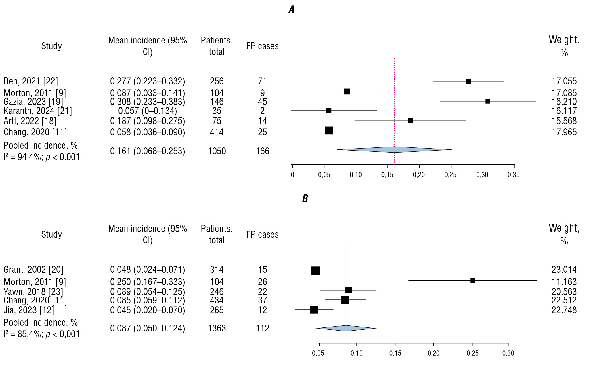 The incidence of immediate FP varied across studies from 5.7% [21] to 27.7% [22], with significant heterogeneity (I² = 94.4%; p < 0.001). The pooled estimate was 16.1% (6.8–25.3%) (Fig. 3, A). The incidence of delayed FP ranged from 4.5% [12] to 25.0% [9], also demonstrating substantial variability (I² = 85.4%; p < 0.001). The pooled estimate was 8.7% (0.5–12.4%) (Fig. 3, B).