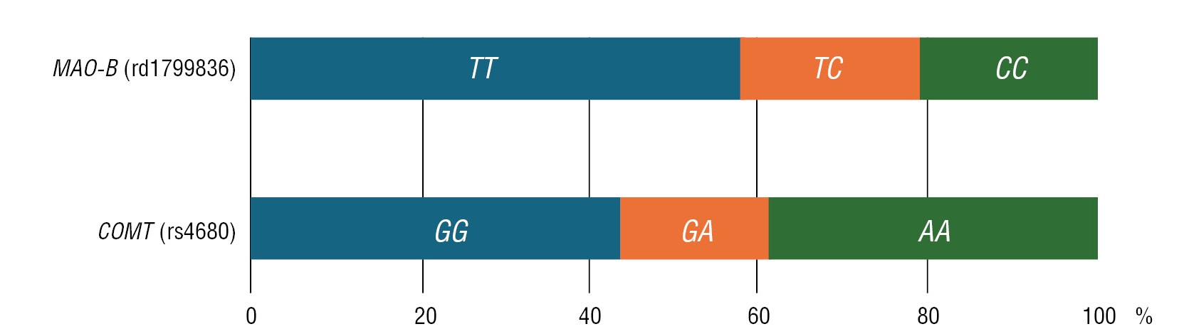 Полиморфный вариант Val158Met (rs4680) гена COMT значительно изменяет активность фермента. Аллель G, кодирующий валин, ассоциирован с более высокой активностью фермента КОМТ и, как следствие, более быстрым истощением запасов дофамина в синапсе; аллель A, кодирующий метионин, связан с медленной активностью КОМТ и более длительным сохранением дофамина в синапсе [10]. Полиморфный вариант A644G (rs1799836) гена MAO-B может изменять активность фермента МАО-Б. Так, генотипы ТТ (АА), ТС (AG), СС (GG) связаны с высокой, промежуточной и низкой активностью данного фермента соответственно [11].