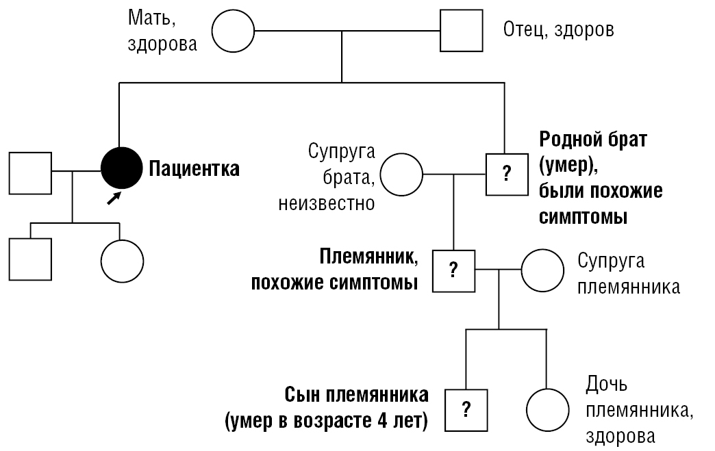 Анализ схемы родословной позволил заподозрить наследственную природу заболевания, однако тип передачи заболевания не был характерным для БП, поскольку складывается впечатление об аутосомно-доминантном наследовании. При этом наличие именно БП, передающейся аутосомно-рецессивно, у умерших родственников (родного брата пациентки, сына племянника) не было подтверждено. Подобный псевдодоминантный вариант наследования возможен лишь в случае носительства мутации жёнами брата и племянника пациентки. С учётом низкой частоты гетерозиготного носительства мутаций в гене GAA вероятность подобного совпадения крайне низка. Для аутосомно-рецессивного наследования характерны случаи заболевания у родственников обоего пола в разных поколениях. Таким образом, полученные при сборе наследственного анамнеза данные не были характерными для БП.
