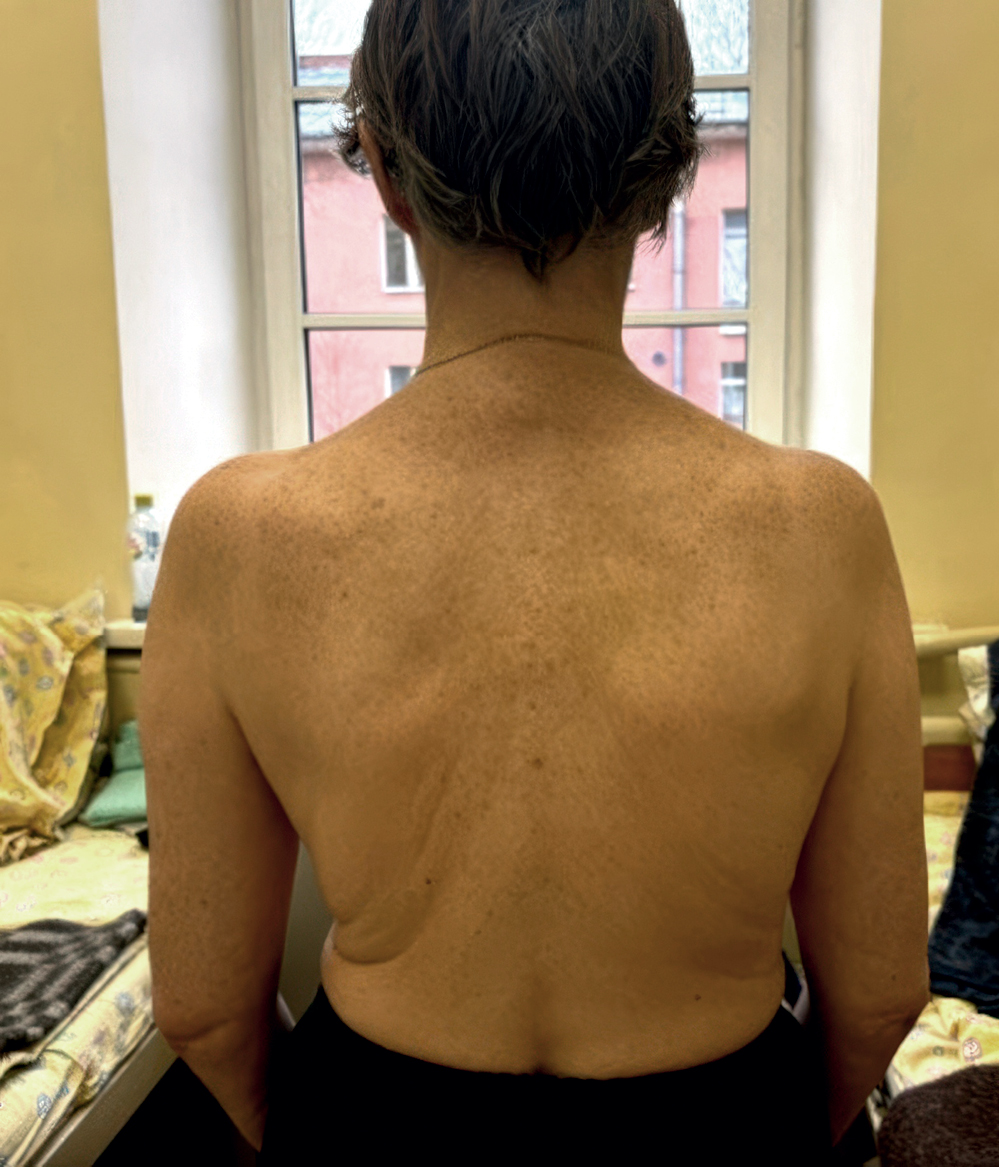 Объём активных движений ограничен при подъёме рук выше горизонтального уровня за счёт мышечной слабости; объём пассивных движений не ограничен. Мышечный тонус диффузно снижен. Выявлена гипотрофия мышц плечевого и тазового пояса, формирующиеся «крыловидные» лопатки (рис. 2). Фасцикуляций и фибрилляций не наблюдалось. Глубокие рефлексы: с рук — равные, средней живости, с ног — равномерно снижены. Из патологических рефлексов выявляются верхний и нижний рефлексы Г.И. Россолимо слева.