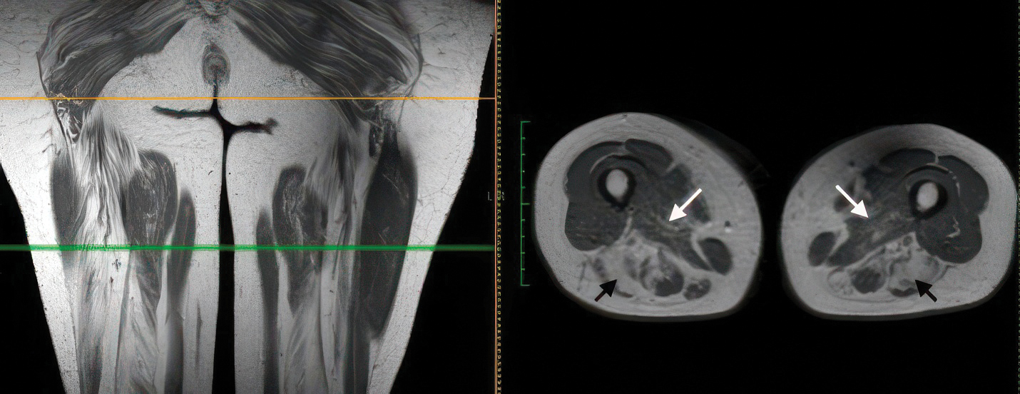 Определяется выраженная симметричная жировая дегенерация задней группы мышц бедра (чёрная стрелка) и умеренно выраженная жировая дегенерация больших приводящих мышц бедра (белая стрелка).