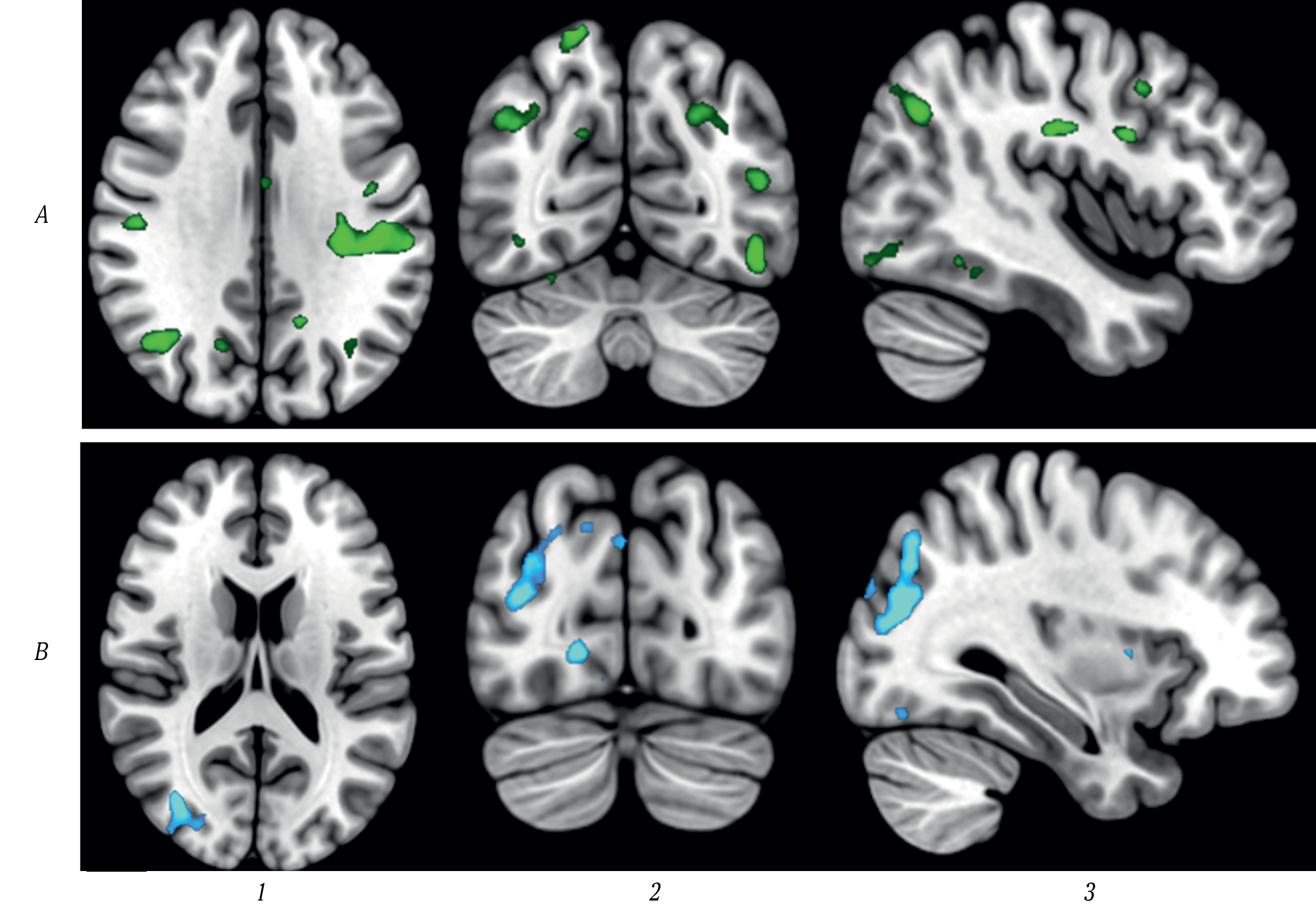 А — пациенты, получавшие сосудисто-метаболическую терапию в течение 10 дней (уменьшение активации в надкраевых и ангулярных извилинах, а также зрительной коре); В — пациенты, получавшие плацебо (уменьшение активации только в зрительной коре).